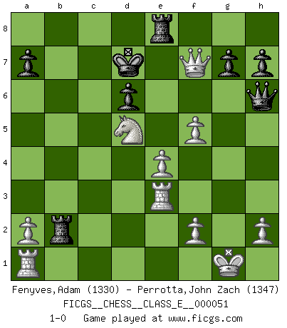 Last move : 1-0 2007 August 13 1:25:18 [Event "FICGS__CHESS__CLASS_E__000051"] [Site "FICGS"] [Date "2007.05.26"] [Round "1"] [White "Fenyves,Adam"] [Black "Perrotta,John Zach"] [Result "1-0"] [WhiteElo "1330"] [BlackElo "1347"] 1.e4 e5 2.d4 exd4 3.c3 dxc3 4.Nxc3 Nc6 5.Bc4 d6 6.Nf3 Nf6 7.O-O Bg4 8.Qb3 Na5 9.Bxf7+ Ke7 10.Qa3 Bxf3 11.gxf3 Kxf7 12.Qxa5 Be7 13.Qb5 Qd7 14.Qxb7 Qh3 15.Qb3+ Kf8 16.Ne2 Nh5 17.Nd4 Bf6 18.Ne6+ Ke7 19.Nxc7 Rab8 20.Nd5+ Kd7 21.Qd1 Be5 22.f4 Bf6 23.Re1 Rhe8 24.Re3 Qe6 25.Qxh5 Bxb2 26.Bxb2 Rxb2 27.f5 Qh6 28.Qf7+ 1-0 Danish gambit Kingside Castling by player White (move 7) Player White won this chess game. Follow this game move after move (download)Chess is really ninety nine percent calculation. (Soltis) Jeder leidlich begabte Spieler, er braucht keineswegs hervorragend veranlagt zu sein, kann es zum Meister bringen. Aber das ist ja auch gar nicht nötig! Der richtige Standpunkt ist es, zu seinem Vergnügen zu spielen, und man glaube ja nicht, dass der Genuss proportional dem Können sei. (Siegbert Tarrasch) Una mala movida nulifica cuarenta buenas. (Horowitz) Que feriez-vous si vous étiez en train de jouer aux échecs et que la fin du monde arrive ? Je continuerais à jouer. (Saint Borromée) Success without honor is an unseasoned dish; it will satisfy your hunger, but it won't taste good. (Joe Paterno)