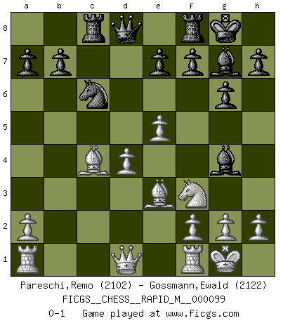 Last move : 0-1 2019 February 3 7:21:19 [Event "FICGS__CHESS__RAPID_M__000099"] [Site "FICGS"] [Date "2018.11.28"] [Round "1"] [White "Pareschi,Remo"] [Black "Gossmann,Ewald"] [Result "0-1"] [WhiteElo "2102"] [BlackElo "2122"] 1.d4 Nf6 2.c4 g6 3.Nc3 d5 4.Nf3 Bg7 5.cxd5 Nxd5 6.e4 Nxc3 7.bxc3 c5 8.Bc4 Nc6 9.Be3 O-O 10.O-O cxd4 11.cxd4 Bg4 12.e5 Rc8 0-1 This chess game has been lost on time (started : 2018.11.28 2:50:38) King's Indian defense, 3.Nc3 Kingside Castling by player Black (move 9) Kingside Castling by player White (move 10) Player Black won this chess game. Follow this game move after move (download)Robert Fischer is a law unto himself. (Larry Evans) Glücklicherweise sind Großmeister Ruben Fines reine Schachbücher weniger phallozentrisch [als seine Schachpsychologie] und deswegen auch weniger lächerlich. (Nigel Short) Antes de los Finales, los dioses han colocado el Juego Medio. (Siegbert Tarrasch) Shah mat. Le roi est mort. Cri de fierté d'un joueur venant de terrasser son adversaire, courtoisement, sans effusion de sang. Crush them ! Make them suffer ! (General Grievous in Star Wars ep.3)