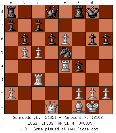 Last move : 1-0 2019 February 9 7:41:20 [Event "FICGS__CHESS__RAPID_M__000099"] [Site "FICGS"] [Date "2018.11.28"] [Round "1"] [White "Schroeder,Christoph"] [Black "Pareschi,Remo"] [Result "1-0"] [WhiteElo "2192"] [BlackElo "2102"] 1.d4 Nf6 2.c4 g6 3.Nc3 Bg7 4.e4 d6 5.Nf3 O-O 6.Be2 e5 7.O-O Nc6 8.d5 Ne7 9.b4 Nh5 10.Re1 f5 11.Ng5 h6 12.Ne6 Bxe6 13.dxe6 Nf4 14.Bxf4 exf4 15.Rc1 Bxc3 16.Rxc3 fxe4 17.Bf1 Nc6 18.b5 Ne5 19.Rxe4 b6 20.c5 1-0 This chess game has been lost on time (started : 2018.11.28 2:50:38) King's Indian : Orthodox, Aronin-Taimanov variation (Yugoslav attack / Mar del Plata variation) Kingside Castling by player Black (move 5) Kingside Castling by player White (move 7) Player White won this chess game. Follow this game move after move (download)I like the moment when I break a man's ego. (Bobby Fischer) Unter Putin wird alles Geld aus Russland wie von einem Staubsauger nach Moskau umgeleitet, das ist wie ein schwarzes Loch. (Garry Kasparov) De eso se trata el Ajedrez. Un día le das una lección a tu oponente y al día siguiente el te da una a tí. (Bobby Fischer) Avec des compensations pour le matériel en plus... (Anonyme) No, I am still playing. (Anatoly Karpov)