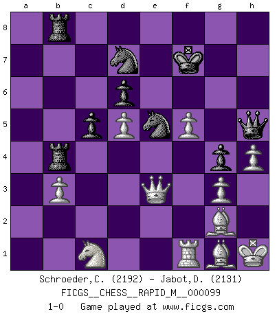 Last move : 1-0 2019 April 29 6:49:44 [Event "FICGS__CHESS__RAPID_M__000099"] [Site "FICGS"] [Date "2018.11.28"] [Round "1"] [White "Schroeder,Christoph"] [Black "Jabot,Daniel"] [Result "1-0"] [WhiteElo "2192"] [BlackElo "2131"] 1.d4 Nf6 2.c4 g6 3.Nc3 Bg7 4.e4 O-O 5.Nf3 c6 6.Be2 d6 7.O-O e5 8.d5 Na6 9.Be3 Ng4 10.Bg5 f6 11.Bh4 c5 12.a3 h5 13.h3 Nh6 14.Bg3 Bd7 15.Nh4 Be8 16.Qd2 Kh7 17.Bd3 Nf7 18.f4 Bh6 19.Ne2 Rg8 20.Qc3 Nb8 21.Rf2 Nd7 22.Raf1 a6 23.a4 b6 24.Kh1 Rb8 25.b3 Rg7 26.Bh2 Kg8 27.Nf3 Rb7 28.Qe1 Nf8 29.fxe5 fxe5 30.Nfg1 Bd7 31.Nc3 g5 32.g3 Ng6 33.Be2 g4 34.h4 Be3 35.Rf5 Bd4 36.Rxh5 Nf8 37.Bd3 Bxc3 38.Qxc3 Nh7 39.Rhf5 Bxf5 40.exf5 Nf6 41.Ne2 Rh7 42.Qc2 e4 43.Bxe4 b5 44.axb5 axb5 45.cxb5 Rxb5 46.Bg2 Ne5 47.Bg1 Rhb7 48.Nc1 Rb4 49.Qc3 Qe8 50.Re1 Nfd7 51.Kh2 Rb8 52.Rf1 Qh5 53.Kh1 Kf7 54.Qe3 1-0 This chess game has been lost on time (started : 2018.11.28 2:50:38) King's Indian : 4.e4 Kingside Castling by player Black (move 4) Kingside Castling by player White (move 7) Player White won this chess game. Follow this game move after move (download)Chess, like any creative activity, can exist only through the combined efforts of those who have creative talent, and those who have the ability to organize their creative work. (Mikhail Botvinnik) Frage des Reporters: -Welche besonderen Umstände rechtfertigen das Anhalten der Uhren während einer Turnierpartie? Antwort: -Einen Fotographen zu strangulieren. (Siegbert Tarrasch) Cuando tengo las piezas blancas, yo gano porque soy blanco; Cuando tengo las piezas negras, yo gano porque soy Bogolyubov. (Bogolyubov) Toutes les manuvres exécutées sur une colonne ouverte ont pour but ultime l'intrusion définitive sur la septième ou la huitième rangée, en plein cur de la position ennemie. (Aaron Nimzovitch) The real voyage of discovery consists not in seeking new lands but in seeing with new eyes. (Marcel Proust)