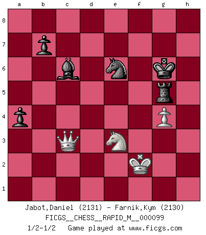 Last move : 1/2-1/2 2019 March 10 10:46:1 [Event "FICGS__CHESS__RAPID_M__000099"] [Site "FICGS"] [Date "2018.11.28"] [Round "1"] [White "Jabot,Daniel"] [Black "Farnik,Kym"] [Result "1/2-1/2"] [WhiteElo "2131"] [BlackElo "2130"] 1.e4 c5 2.Nf3 d6 3.d4 cxd4 4.Nxd4 Nf6 5.Nc3 a6 6.Bg5 e6 7.f4 Qb6 8.Qd2 Qxb2 9.Rb1 Qa3 10.e5 h6 11.Bh4 dxe5 12.fxe5 Nfd7 13.Ne4 Qxa2 14.Rd1 Qd5 15.Qe3 Qxe5 16.Be2 Bc5 17.Bg3 Bxd4 18.Rxd4 Qa5+ 19.Rd2 O-O 20.Bd6 Nc6 21.O-O Nce5 22.R2d1 Nc6 23.Rd2 Qd8 24.Bh5 f6 25.Kh1 Qa5 26.Bxf8 Qxh5 27.Bxg7 Kxg7 28.Rf3 Nce5 29.Rh3 Ng4 30.Qe2 Qg6 31.Rc3 Nf8 32.h3 Bd7 33.Rg3 f5 34.Nf2 Bb5 35.c4 Bxc4 36.Qe1 h5 37.Rd4 Bd5 38.hxg4 h4 39.gxf5 Qxg3 40.Rg4+ Kf7 41.fxe6+ Nxe6 42.Rxg3 hxg3 43.Ng4 Rh8+ 44.Kg1 Rh5 45.Qxg3 Rg5 46.Qd3 a5 47.Ne3 Bc6 48.g4 a4 49.Kf2 Kf6 50.Qc3+ Kg6 1/2-1/2 Sicilian : Najdorf, 7...Qb6 Kingside Castling by player Black (move 19) Kingside Castling by player White (move 21) 10 pieces endgame at move 45 : White KQNP , Black KRBNPP WHITE : King + 1 Queen 1 Knight 1 Pawn BLACK : King + 1 Rook 1 Bishop 1 Knight 2 Pawns This chess game ended in a draw. Follow this game move after move (download)Chess is a foolish expedient for making idle people believe they are doing something very clever when they are only wasting their time. (George Bernard Shaw) Wer wird heute Abend ihr Gegner sein? -- Heute Abend spiele ich gegen die schwarzen Steine. (Akiba Rubinstein) Muchos se han convertido en Maestros de Ajedrez, nadie se ha convertido en el Maestro del Ajedrez. (Siegbert Tarrasch) Assurément je connaissais par expérience le mystérieux attrait de ce jeu royal, le seul entre tous les jeux inventés par les hommes qui échappe souverainement à la tyrannie du hasard, le seul où l'on ne doive sa victoire qu'à son intelligence ou plutôt à une certaine forme d'intelligence. Mais n'est-ce pas déjà le limiter injurieusement que d'appeler les échecs un jeu ? N'est-ce pas une science, un art ou quelque chose qui, comme le cercueil de Mahomet entre ciel et terre, est suspendu entre l'un et l'autre, et qui réunit un nombre incroyable de contraires ? [...] C'est une pensée qui ne mène à rien, une mathématique qui n'établit rien, un art qui ne laisse pas d'uvre, une architecture sans matière; et il l'a prouvé néanmoins qu'il était plus durable, à sa manière, que les livres ou que tout autre monument, ce jeu unique qui appartient à tous les peuples et à tous les temps, et dont personne ne sait quel dieu en fit don à la terre pour tuer l'ennui, pour aiguiser l'esprit et stimuler l'âme. Où commence-t-il, où finit-il ? (Stefan Zweig) Internet: Absolute communication, absolute isolation. (Paul Carvel)