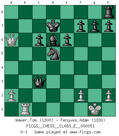 Last move : 0-1 2007 June 14 16:44:23 [Event "FICGS__CHESS__CLASS_E__000051"] [Site "FICGS"] [Date "2007.05.26"] [Round "1"] [White "Wawer,Tom"] [Black "Fenyves,Adam"] [Result "0-1"] [WhiteElo "1300"] [BlackElo "1330"] 1.e4 d5 2.exd5 Qxd5 3.Nc3 Qa5 4.Nf3 Nf6 5.d4 Bg4 6.Bc4 Nc6 7.O-O O-O-O 8.Bd2 Nxd4 9.Nb5 Nxf3+ 10.gxf3 Rxd2 11.Qe1 Bxf3 12.Qe5 Qb6 13.Qf5+ e6 14.Qxf3 c6 15.Nc3 Qxb2 16.Qe3 Rxc2 17.Rab1 Qxc3 18.Qxa7 Rb2 19.Rfd1 Nd5 20.Ba6 bxa6 21.Qxa6+ Kd7 22.Rdc1 Rxb1 23.Rxb1 Bd6 0-1 Scandinavian (centre counter) defense Kingside Castling by player White (move 7) Queenside Castling by player Black (move 7) Player Black won this chess game. Follow this game move after move (download)In complicated positions, Bobby Fischer hardly had to be afraid of anybody. (Paul Keres) Wenn du auf das Glück wartest, wird das Leben ziemlich langweilig. (Mikhail Nekhemyevich Tal) Juega la Apertura como un libro, el Juego Medio como un mago y los Finales como una máquina. (Spielmann) Les écrivains ont utilisé les échecs pour analyser les côtés extrêmes de la nature humaine. Dans ce cadre, les échecs offrent un champ d'expérimentation idéal. Mais on pourrait faire la même chose avec la peinture. Et là, en vous référant à Van Gogh, vous ne tirerez pas de conclusion définitive sur les peintres. (Gary Kasparov) Life is painting a picture, not doing a sum. (Oliver Wendell Holmes, Jr.)