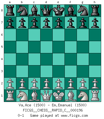 Last move : 0-1 2018 December 28 15:38:27 [Event "FICGS__CHESS__RAPID_C__000196"] [Site "FICGS"] [Date "2018.11.28"] [Round "1"] [White "Va,Ace"] [Black "Em,Emanuel"] [Result "0-1"] [WhiteElo "1500"] [BlackElo "1500"] 0-1 This chess game has been lost on time (started : 2018.11.28 3:58:48) Player Black won this chess game. Follow this game move after move (download)The most powerful weapon in Chess is to have the next move. (David Bronstein) Warum muß ich gegen diesen IDIOTEN verlieren? (Aaron Nimzowitsch) La vida es como el Ajedrez, con lucha, competición y eventos buenos y malos. (Benjamin Franklin) Il s'avisa de me proposer d'apprendre les échecs qu'il jouait un peu... me voilà forcené des échecs. J'achète un échiquier, je m'enferme dans ma chambre, j'y passe des jours et des nuits à vouloir apprendre par cœur toutes les parties. (Jean-Jacques Rousseau, Confessions) Empty your mind, be formless, shapeless — like water. (Bruce Lee)