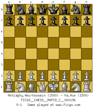 Last move : 0-1 2018 December 28 15:38:27 [Event "FICGS__CHESS__RAPID_C__000196"] [Site "FICGS"] [Date "2018.11.28"] [Round "1"] [White "Akhlaghy,Amirhossein"] [Black "Va,Ace"] [Result "0-1"] [WhiteElo "1500"] [BlackElo "1500"] 0-1 This chess game has been lost on time (started : 2018.11.28 3:58:48) Player Black won this chess game. Follow this game move after move (download)When you play Bobby, it is not a question if you win or lose. It is a question if you survive. (Boris Spassky) Capablanka war das größte Genie der Schachgeschichte! Aber denken sie nicht er habe nichts vom Schach verstanden. Er wusste nur soviel wie er wissen musste um seine Ziele zu erreichen. (Mikhail Moiseyevich Botvinik) No puedes jugar al Ajedrez si eres de corazón noble. (Proverbio Francés) Un footballeur joue avec ses pieds, parfois avec sa tête. Un joueur d'échecs ne joue qu'avec sa tête. Et quand il ne joue plus, il meurt. (Jacob Murray) Kids, you tried your best and you failed miserably. The lesson is, never try. (Simpsons)
