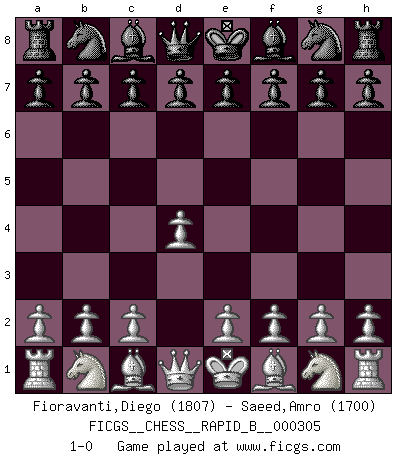Last move : 1-0 2018 December 31 3:43:16 [Event "FICGS__CHESS__RAPID_B__000305"] [Site "FICGS"] [Date "2018.11.28"] [Round "1"] [White "Fioravanti,Diego"] [Black "Saeed,Amro"] [Result "1-0"] [WhiteElo "1807"] [BlackElo "1700"] 1.d4 1-0 This chess game has been lost on time (started : 2018.11.28 14:8:44) Queen's pawn Player White won this chess game. Follow this game move after move (download)I'd rather have a Pawn than a finger. (Reuben Fine) Ich erzeugte keinen Neid, da mich die Schachspieler als Musiker und die Musiker als Schachspieler betrachteten. (Mark Taimanov) Todavía soy una víctima del Ajedrez. Tiene toda la belleza del arte y mucho mas. No puede ser comercializado. El Ajedrez es mas puro que el arte en su posición social. (Marcel Duchamp) J'apprécie les joueurs d'est-indienne, c'est grâce à eux que je nourris ma famille depuis tant d'années. (Petrosian) Never was anything great achieved without danger. (Niccolo Machiavelli)