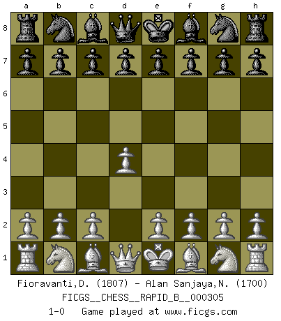 Last move : 1-0 2018 December 31 3:43:16 [Event "FICGS__CHESS__RAPID_B__000305"] [Site "FICGS"] [Date "2018.11.28"] [Round "1"] [White "Fioravanti,Diego"] [Black "Alan Sanjaya,Nicko"] [Result "1-0"] [WhiteElo "1807"] [BlackElo "1700"] 1.d4 1-0 This chess game has been lost on time (started : 2018.11.28 14:8:44) Queen's pawn Player White won this chess game. Follow this game move after move (download)If cunning alone were needed to excel, women would be the best Chess players. (Albin) Ich hatte Angst gegen einen russischen Großmeister zu verlieren, und er befürchtete gegen einen kleinen Jungen zu verlieren. (über ein Remis gegen Juri Awerbach). (Robert James Fischer) El juego del Ajedrez no es solamente una diversión quieta; algunas cualidades muy valuables de la mente se pueden adquirir y cultivar con el, como convertirlos en habitos disponibles para toda ocasión; ya que la vida es algo así como el Ajedrez. (Benjamin Franklin) Il n'y a pas de prix trop élevé au scalp de l'ennemi. (Koblentz) I'm extremely disappointed. I send you out for exciting, new designer drugs, you come back with tomato sauce. (Gregory House, House M.D.)