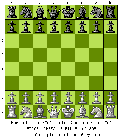 Last move : 0-1 2018 December 28 15:38:27 [Event "FICGS__CHESS__RAPID_B__000305"] [Site "FICGS"] [Date "2018.11.28"] [Round "1"] [White "Haddadi,Abdelmajid"] [Black "Alan Sanjaya,Nicko"] [Result "0-1"] [WhiteElo "1800"] [BlackElo "1700"] 0-1 This chess game has been lost on time (started : 2018.11.28 14:8:44) Player Black won this chess game. Follow this game move after move (download)I still hope to kill Fischer. (Boris Spassky) Irgendwie scheint mir sonntags früh um 9 Uhr der Killerinstinkt verloren gegangen zu sein. (Alexej Shirov) Un Peón pasado aumenta su poder a medida de que el número de piezas en el tablero disminuye. (Capablanca) Botvinnik disait en comparant les échecs à la musique: Il existe une science dont le but est l'étude de l'acoustique et des sons. Mais il y a aussi un art qui se sert de l'océan des sons : c'est la musique. De toute évidence, il en est de même pour la pensée. La logique est l'étude des lois de la réflexion et les échecs reflètent, en tant qu'art, le côté logique de la réflexion, sous la forme d'images artistiques... Extrait de Fischer - Spassky, Reykjavik 1972 par Alexander & F. Wyndham (Ed. Solar), p 37. All maxims have their antagonist maxims; proverbs should be sold in pairs, a single one being but a half truth. (William Mathews)