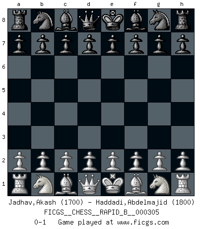 Last move : 0-1 2018 December 28 15:38:27 [Event "FICGS__CHESS__RAPID_B__000305"] [Site "FICGS"] [Date "2018.11.28"] [Round "1"] [White "Jadhav,Akash"] [Black "Haddadi,Abdelmajid"] [Result "0-1"] [WhiteElo "1700"] [BlackElo "1800"] 0-1 This chess game has been lost on time (started : 2018.11.28 14:8:44) Player Black won this chess game. Follow this game move after move (download)When in doubt... play Chess ! (Tevis) Bogoljubow: Matt in vier Zügen! Tartakower: Ich verbitte mir jede Belästigung! (Savielly Grigorievitsch Tartakower) Solo puedes ser bueno en el Ajedrez si amas al juego. (Bobby Fischer) Je fais ceci parce que dans cinquante coups j'obtiendrai cela; je m'appelle Mikhail Moisevitch Botvinnik. (Botvinnik) All war is based on deception. (Sun Tzu)
