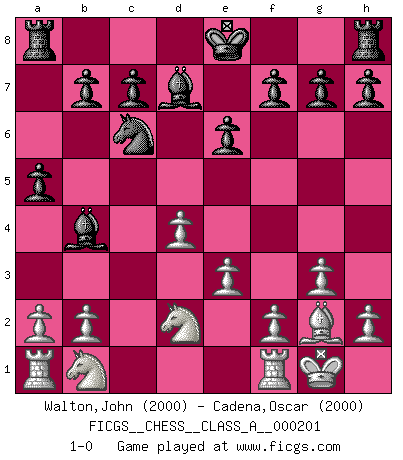 Last move : 1-0 2019 February 23 9:14:45 [Event "FICGS__CHESS__CLASS_A__000201"] [Site "FICGS"] [Date "2018.11.29"] [Round "1"] [White "Walton,John"] [Black "Cadena,Oscar"] [Result "1-0"] [WhiteElo "2000"] [BlackElo "2000"] 1.d4 Nf6 2.c4 e6 3.g3 d5 4.Nf3 dxc4 5.Bg2 Bb4+ 6.Bd2 a5 7.Qc2 Nc6 8.Qxc4 Qd5 9.Qd3 Qe4 10.Qxe4 Nxe4 11.e3 Nxd2 12.Nfxd2 Bd7 13.O-O 1-0 Catalan Opening Kingside Castling by player White (move 13) Player White won this chess game. Follow this game move after move (download)Chess is war over the board. The object is to crush the opponents mind. (Bobby Fischer) Ohne Leiden bildet sich kein Charakter. (Ernst Freiherr von Feuchtersleben) El Ajedrez hace al hombre ser mas sabio y ver mas claro. (Vladimir Putin) Je crois qu'il existe des manières très spécifiques de jouer efficacement contre une machine. Evidemment, nous n'avons aucune chance en technique pure, parce que l'ordinateur calcule de manière parfaite. Mais lorsque nous faisons appel à notre cerveau, en utilisant l'intuition et la compréhension, alors nous restons beaucoup plus forts. (Anatoli Karpov) Depression is just anger without enthusiasm. (Unknown)