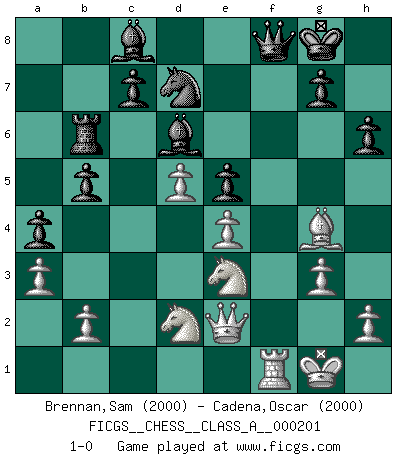 Last move : 1-0 2019 February 23 9:14:45 [Event "FICGS__CHESS__CLASS_A__000201"] [Site "FICGS"] [Date "2018.11.29"] [Round "1"] [White "Brennan,Sam"] [Black "Cadena,Oscar"] [Result "1-0"] [WhiteElo "2000"] [BlackElo "2000"] 1.d4 d5 2.c4 e6 3.Nf3 Nf6 4.g3 dxc4 5.Bg2 Bb4+ 6.Bd2 a5 7.O-O O-O 8.Bg5 Nc6 9.e3 Ra6 10.Qe2 h6 11.Bxf6 Qxf6 12.a3 Bd6 13.Nfd2 e5 14.d5 Nb8 15.Nxc4 Nd7 16.Nbd2 Qe7 17.Rac1 a4 18.e4 Nc5 19.f4 f6 20.fxe5 fxe5 21.Rxf8+ Qxf8 22.Bf3 b5 23.Ne3 Rb6 24.Rf1 Nd7 25.Bg4 1-0 Queen's gambit declined Kingside Castling by player White (move 7) Kingside Castling by player Black (move 7) Player White won this chess game. Follow this game move after move (download)The way he plays Chess demonstrates a man's whole nature. (Stanley Ellin) Ich kenne Menschen, die allen Willen der Welt besitzen und doch nicht Schach spielen können. (Robert James Fischer) El Ajedrez demanda una total concentración. (Bobby Fischer) Les échecs sont un jeu terrible. Si vous n'avez pas le centre, votre adversaire a une position plus libre. Par contre, si vous avez le centre, alors vous avez vraiment quelque chose pour laquelle vous inquiéter ! (Siegbert Tarrasch) A married woman is like a fish riding a bicycle. (Rodolfo d'Ettorre)