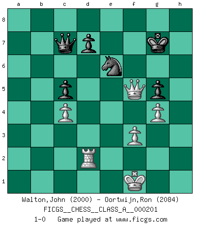 Last move : 1-0 2019 February 28 9:48:28 [Event "FICGS__CHESS__CLASS_A__000201"] [Site "FICGS"] [Date "2018.11.29"] [Round "1"] [White "Walton,John"] [Black "Oortwijn,Ron"] [Result "1-0"] [WhiteElo "2000"] [BlackElo "2084"] 1.d4 Nf6 2.c4 e5 3.dxe5 Ne4 4.a3 b6 5.Nf3 Bb7 6.g3 f6 7.Bg2 Nc6 8.Qc2 Nc5 9.exf6 Nd4 10.f7+ Kxf7 11.Qd1 Nxf3+ 12.Bxf3 Bxf3 13.exf3 g6 14.b4 Bg7 15.Ra2 Re8+ 16.Kf1 Ne6 17.Bb2 Bxb2 18.Rxb2 a5 19.Kg2 axb4 20.axb4 Ra1 21.Re1 Qg5 22.Re4 Re7 23.h4 Qf6 24.Rd2 Kg8 25.Qc2 Qf8 26.Nc3 Rf7 27.Nd5 Rxf3 28.Ne7+ Qxe7 29.Kxf3 c5 30.Qd3 Nd4+ 31.Kg2 Qf8 32.bxc5 bxc5 33.Qe3 Ra8 34.g4 Qc8 35.f3 Ne6 36.h5 Qc6 37.Re2 Rf8 38.hxg6 hxg6 39.Qh6 Ng7 40.Rf4 Rxf4 41.Qxf4 Ne6 42.Qf6 g5 43.Qg6+ Kf8 44.Qf5+ Kg7 45.Rd2 Qc7 46.Kf1 1-0 Budapest : Fajarowicz variation Player White won this chess game. Follow this game move after move (download)We must make sure that Chess will not be like a dead language, very interesting, but for a very small group. (Sytze Faber) Schach ist mein Leben, meine Leidenschaft, was ich gelernt habe und seit meinem 14. Lebensjahr profimässig praktiziere. Darauf zu verzichten, würde mir sehr schwer fallen. (Viktor Kortschnoi) Cuando le juegas a Fischer, no es una cuestion de si vas a ganar o perder. Es una cuestion de si vas a sobrevivir. (Boris Spassky) D'abord les bases : Jouez et étudiez, puis étudiez et jouez, ensuite jouez et étudiez, puis étudiez et jouez. Deuxièmement : Donnez toujours le meilleur de vous-même ! (Ken Smith) Optimism is a variety of information deficit. Sometimes especially true for correspondence chess games. (Michael Aigner)