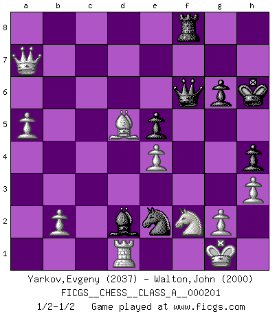 Last move : 1/2-1/2 2019 April 14 7:24:34 [Event "FICGS__CHESS__CLASS_A__000201"] [Site "FICGS"] [Date "2018.11.29"] [Round "1"] [White "Yarkov,Evgeny"] [Black "Walton,John"] [Result "1/2-1/2"] [WhiteElo "2037"] [BlackElo "2000"] 1.e4 c5 2.Nf3 e6 3.d4 cxd4 4.Nxd4 a6 5.Bd3 Bc5 6.Nb3 Be7 7.Qg4 g6 8.Qe2 d6 9.O-O Nd7 10.Nc3 Qc7 11.a4 b6 12.Be3 Bb7 13.Rad1 h5 14.h3 h4 15.Qe1 Rc8 16.Bd4 Ngf6 17.Qe2 Ra8 18.f4 Rh7 19.Rf2 e5 20.fxe5 dxe5 21.Be3 Nh5 22.Bc4 Ng3 23.Qd3 Nf6 24.Rxf6 Bxf6 25.Nd5 Bxd5 26.Bxd5 Rb8 27.Qxa6 Qxc2 28.Re1 Qc8 29.Qb5+ Kf8 30.Bxb6 Kg7 31.a5 Qc2 32.Qd7 Bg5 33.Qxf7+ Kh6 34.Qf2 Rc7 35.Qf3 Bf4 36.Bxc7 Qxc7 37.Qf2 Qd6 38.Nc1 Rf8 39.Nd3 Bg5 40.Qa7 Bd2 41.Rd1 Qf6 42.Nf2 Ne2+ 1/2-1/2 Sicilian : Kan, Polugaievsky variation Kingside Castling by player White (move 9) This chess game ended in a draw. Follow this game move after move (download)You must take your opponent into a deep dark forest where 2+2=5, and the path leading out is only wide enough for one. (Mikhail Tal) Auf Remis zu spielen ist gewissermaßen ein Verbrechen gegen das Schachspiel. (Mikhail Nekhemyevich Tal) Un jugador que trata de regresar una movida en el Ajedrez es un futuro carterista. (Richard Fenton) Le pion, dans sa simplicité, marche droit devant lui, mais lorsqu'il prend, il le fait obliquement? Ainsi l'homme, tant qu'il reste pauvre, marche dans la droiture et vit honnêtement, mais lorsqu'il recherche les honneurs, il flatte, se parjure et, par les voies obliques, cherche une position supérieure sur l'échiquier du monde. (Jean de Galles) He is a liar. I just don't know what the lie is yet. (Horatio Caine, C.S.I. Miami)