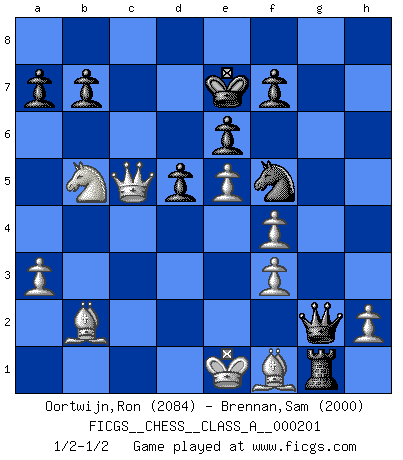 Last move : 1/2-1/2 2018 December 10 15:37:11 [Event "FICGS__CHESS__CLASS_A__000201"] [Site "FICGS"] [Date "2018.11.29"] [Round "1"] [White "Oortwijn,Ron"] [Black "Brennan,Sam"] [Result "1/2-1/2"] [WhiteElo "2084"] [BlackElo "2000"] 1.e4 e6 2.d4 d5 3.Nc3 Bb4 4.e5 c5 5.a3 Bxc3+ 6.bxc3 Ne7 7.Qg4 cxd4 8.Qxg7 Rg8 9.Qxh7 Qc7 10.Ne2 dxc3 11.f4 Nbc6 12.Nxc3 Nd4 13.Qd3 Nef5 14.Bb2 Bd7 15.O-O-O Rc8 16.Rd2 Qa5 17.Rg1 Bb5 18.Nxb5 Rxc2+ 19.Kd1 Rxd2+ 20.Qxd2 Qa4+ 21.Ke1 Nf3+ 22.gxf3 Rxg1 23.Qb4 Qc2 24.Qc3 Qg2 25.Qc8+ Ke7 26.Qc5+ 1/2-1/2 French : Winawer, Advance, poisoned pawn variation Queenside Castling by player White (move 15) This chess game ended in a draw. Follow this game move after move (download)The blunders are all there on the board, waiting to be made. (Savielly Tartakover) Charakterschwächen offenbaren sich normalerweise während einer Schachpartie. (Garry Kasparov) No hay precio que sea tan grande por la cabellera del Rey enemigo. (Koblentz) Ce qui caractérise les parties de combat, c'est que si le défenseur a constamment de difficiles problèmes à résoudre, l'attaquant doit chercher sans relâche de nouvelles possibilités d'attaque. (Koblentz) The arrogant army will lose certainly the battle. (Chinese proverb)