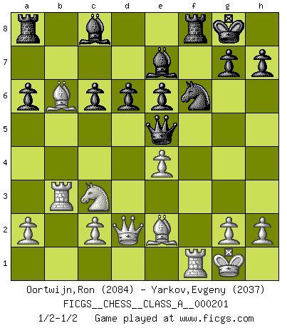 Last move : 1/2-1/2 2018 December 6 9:0:53 [Event "FICGS__CHESS__CLASS_A__000201"] [Site "FICGS"] [Date "2018.11.29"] [Round "1"] [White "Oortwijn,Ron"] [Black "Yarkov,Evgeny"] [Result "1/2-1/2"] [WhiteElo "2084"] [BlackElo "2037"] 1.e4 c5 2.Nf3 d6 3.d4 cxd4 4.Nxd4 Nf6 5.Nc3 a6 6.Bg5 e6 7.f4 Qb6 8.Qd2 Qxb2 9.Rb1 Qa3 10.f5 Nc6 11.fxe6 fxe6 12.Nxc6 bxc6 13.Be2 Be7 14.O-O O-O 15.Rb3 Qc5+ 16.Be3 Qe5 17.Bd4 Qa5 18.Bb6 Qe5 19.Bd4 Qa5 20.Bb6 Qe5 1/2-1/2 Sicilian : Najdorf, 7...Qb6 Kingside Castling by player White (move 14) Kingside Castling by player Black (move 14) This chess game ended in a draw. Follow this game move after move (download)Pawn endings are to Chess what putting is to golf. (Cecil Purdy) Über Frauen: Chess is better. (Robert James Fischer) Los problemas de Ajedrez exigen del compositor las mismas virtudes que caracterizan todo el arte de valor: originalidad, invención, concisión, armonía, complejidad e insinceridad explendida. (Vladimir Nabokov) Je ne crois pas en la psychologie, je crois aux bons coups. (Robert Fischer) Being number two sucks. (Andre Agassi)