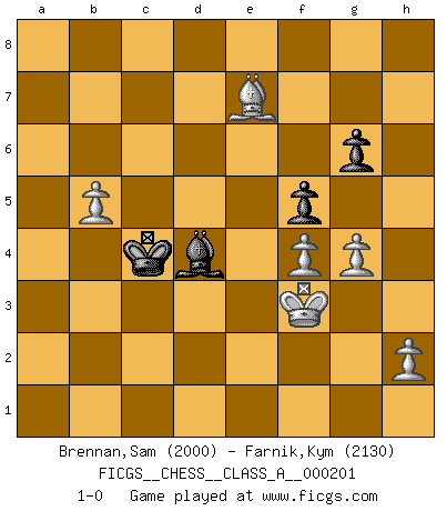 Last move : 1-0 2018 December 20 21:53:54 [Event "FICGS__CHESS__CLASS_A__000201"] [Site "FICGS"] [Date "2018.11.29"] [Round "1"] [White "Brennan,Sam"] [Black "Farnik,Kym"] [Result "1-0"] [WhiteElo "2000"] [BlackElo "2130"] 1.d4 Nf6 2.c4 g6 3.g3 d5 4.cxd5 c6 5.dxc6 Nxc6 6.Nf3 e5 7.Bg2 exd4 8.Nbd2 Bg7 9.Nb3 Nh5 10.e3 dxe3 11.Qxd8+ Nxd8 12.Bxe3 Bxb2 13.Rb1 Bc3+ 14.Ke2 b6 15.Rhc1 Bg7 16.Ne5 Ba6+ 17.Ke1 Rb8 18.Nc5 Rc8 19.Nxa6 Rxc1+ 20.Bxc1 Bxe5 21.Ba3 Ng7 22.f4 Bd4 23.Rc1 Nge6 24.Bf1 Nb7 25.Nc7+ Nxc7 26.Rxc7 Nc5 27.Bb5+ Kd8 28.Rxa7 f5 29.Bc1 Rf8 30.Rxh7 Rf6 31.Bd2 Re6+ 32.Kf1 Re7 33.Rxe7 Kxe7 34.Bb4 Kf6 35.Ke2 Bb2 36.Bc4 Bd4 37.Kf3 Ne6 38.Bxe6 Kxe6 39.a4 Kd5 40.Be7 Kc4 41.g4 b5 42.axb5 1-0 King's Indian : 3.g3 10 pieces endgame at move 42 : White KBPPPP , Black KBPP WHITE : King + 1 Bishop 4 Pawns BLACK : King + 1 Bishop 2 Pawns Player White won this chess game. Follow this game move after move (download)We don't really know how the game was invented, though there are suspicions. As soon as we discover the culprits, we'll let you know. (Bruce Pandolfini) Ich spiele 70 Eröffnungssysteme. (Viktor Kortschnoi) El Ajedrez, como la música, como el amor, tiene el poder de hacer feliz a la gente. (Siegbert Tarrasch) Un millionnaire : 'Monsieur Steinitz ! Vous ne participez aux tournois que pour l'argent, alors que moi je n'y viens que pour l'honneur.' Steinitz : 'Chacun joue pour ce qu'il n'a pas'... A good programmer is someone who always looks both ways before crossing a one-way street. (Doug Linder)