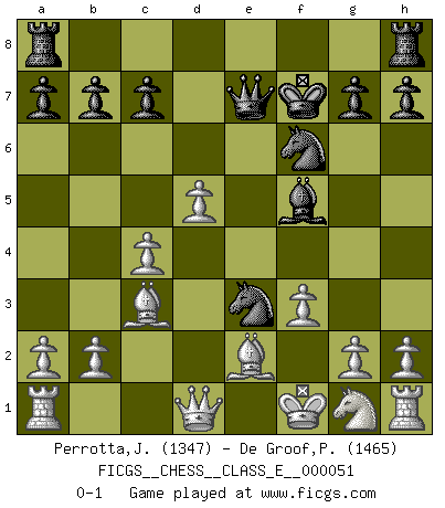 Last move : 0-1 2007 July 22 18:38:31 [Event "FICGS__CHESS__CLASS_E__000051"] [Site "FICGS"] [Date "2007.05.26"] [Round "1"] [White "Perrotta,John Zach"] [Black "De Groof,Pieter"] [Result "0-1"] [WhiteElo "1347"] [BlackElo "1465"] 1.e4 d5 2.exd5 Nf6 3.d4 Bg4 4.f3 Bf5 5.c4 e6 6.dxe6 Nc6 7.exf7+ Kxf7 8.d5 Bb4+ 9.Bd2 Qe7+ 10.Be2 Nd4 11.Nc3 Bxc3 12.Bxc3 Nc2+ 13.Kf1 Ne3+ 0-1 Scandinavian defense Player Black won this chess game. Follow this game move after move (download)A sacrifice is best refuted by accepting it. (Wilhelm Steinitz) Es ist schade, dass viele Schachsportler vergessen, wie wichtig Auftreten und angemessene Kleidung sind. (Alexandra Kosteniuk) Hay jugadores fuertes y personas amables y yo soy un jugador fuerte. (Bobby Fischer) Dans le domaine de la peinture, de la gravure et de la sculpture, dès la première décennie de notre siècle, les artistes abandonnent la représentation de la partie d'échecs pour se concentrer sur les pièces, sur les échiquiers et sur toutes les variations auxquelles les unes et les autres peuvent donner lieu. On passe en quelque sorte d'un thème social à un thème musical (au sens de la musica médiévale, c'est-à-dire d'une notion qui inclue le rythme, l'harmonie, la construction et la déconstruction, etc.). Graphiquement et picturalement, l'échiquier apparaît comme une structure ouverte, dynamique, d'une richesse infinie, autorisant toutes les combinatoires et débouchant sur des mouvements et des rythmes de nature exponentielle. (Michel Pastoureau) There is a computer disease that anybody who works with computers knows about. It's a very serious disease and it interferes completely with the work. The trouble with computers is that you 'play' with them ! (Richard P. Feynman)