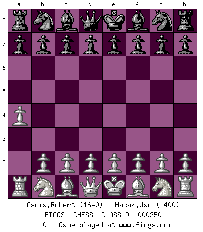 Last move : 1-0 2019 January 10 16:43:54 [Event "FICGS__CHESS__CLASS_D__000250"] [Site "FICGS"] [Date "2018.12.01"] [Round "1"] [White "Csoma,Robert"] [Black "Macak,Jan"] [Result "1-0"] [WhiteElo "1640"] [BlackElo "1400"] 1.a4 1-0 This chess game has been lost on time (started : 2018.12.01 9:7:5) Ware (Meadow Hay) Opening Player White won this chess game. Follow this game move after move (download)My opponents make good moves too. Sometimes I don't take these things into consideration. (Bobby Fischer) Ich las kürzlich ein Buch von Nietzsche. Er sagte Religion verdumme nur die Menschen. Ich stimme zu. (Robert James Fischer) Nos gusta pensar. (Gary Kasparov) Les échecs sont utiles à l'exercice de la faculté de penser et à celle de l'imagination. Car nous devons posséder une méthode élaborée pour atteindre des buts partout où nous devons conduire notre raison. (Leibnitz) A generalist learns less and less about more and more until he knows nothing about everything. (Author unknown)