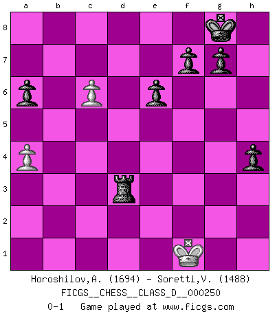 Last move : 0-1 2019 January 20 13:54:47 [Event "FICGS__CHESS__CLASS_D__000250"] [Site "FICGS"] [Date "2018.12.01"] [Round "1"] [White "Horoshilov,Andrey"] [Black "Soretti,Vincenzo"] [Result "0-1"] [WhiteElo "1694"] [BlackElo "1488"] 1.e4 c5 2.Nf3 d6 3.Nc3 e6 4.Bb5+ Bd7 5.Qe2 Nc6 6.a4 a6 7.Bxc6 Bxc6 8.d3 Be7 9.Be3 Nf6 10.h3 Qd7 11.e5 Nd5 12.Nxd5 Bxd5 13.O-O Bxf3 14.Qxf3 dxe5 15.Qg3 Bf6 16.Bxc5 Rc8 17.b4 b6 18.Bxb6 Rxc2 19.Rfe1 O-O 20.Bc5 Rd8 21.Re3 Rc3 22.f4 Rxd3 23.fxe5 Rxe3 24.Qxe3 Be7 25.Qf3 Bxc5+ 26.bxc5 Qd4+ 27.Qf2 Qxa1+ 28.Kh2 Qxe5+ 29.g3 h5 30.c6 h4 31.Qc2 Qxg3+ 32.Kh1 Qxh3+ 33.Kg1 Qg3+ 34.Kf1 Qd3+ 35.Qxd3 Rxd3 0-1 Sicilian Kingside Castling by player White (move 13) Kingside Castling by player Black (move 19) 10 pieces endgame at move 35 : White KPP , Black KRPPPPP WHITE : King + 2 Pawns BLACK : King + 1 Rook 5 Pawns Player Black won this chess game. Follow this game move after move (download)Chess demands total concentration. (Bobby Fischer) Schach ist ein Reich, wo sich die menschliche Phantasie frei entfalten kann. (David Bronstein) Ciertamente el estado mental actual de Bobby Fischer es una tragedia. Uno de los mas grandes jugadores de Ajedrez del mundo -el orgullo y pena del Ajedrez Americano. (Frank Brady) La tactique, c'est ce que vous faites quand il y a quelque chose à faire; la stratégie, c'est ce que vous faites quand il n'y a rien à faire. (Savielli Tartacower) Every now and then a man's mind is stretched by a new idea and never shrinks back to its former dimensions. (Oliver Wendell Holmes, Sr.)