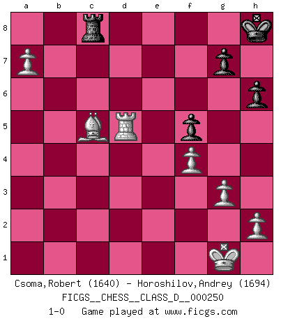 Last move : 1-0 2019 January 17 18:26:26 [Event "FICGS__CHESS__CLASS_D__000250"] [Site "FICGS"] [Date "2018.12.01"] [Round "1"] [White "Csoma,Robert"] [Black "Horoshilov,Andrey"] [Result "1-0"] [WhiteElo "1640"] [BlackElo "1694"] 1.a4 b6 2.b4 e5 3.c3 Bb7 4.Ba3 Nf6 5.d4 e4 6.e3 d5 7.Be2 Be7 8.Nh3 h6 9.O-O a6 10.Nd2 c6 11.c4 Nbd7 12.Qb3 O-O 13.cxd5 cxd5 14.Rac1 Nh7 15.Rc2 f5 16.Rfc1 Kh8 17.Rc7 Rb8 18.Nf4 Bd6 19.R7c2 Rf6 20.Nxd5 Rg6 21.Nf4 Bxf4 22.exf4 e3 23.Nf3 exf2+ 24.Kxf2 Bxf3 25.Bxf3 Qh4+ 26.Kg1 Qf6 27.Bb2 Qd6 28.Bh5 Rf6 29.d5 R6f8 30.g3 Nhf6 31.Bf3 a5 32.Ba3 b5 33.Rc6 Qe7 34.Re6 Qd8 35.bxa5 bxa4 36.Qxa4 Re8 37.a6 Nb6 38.Rxe8+ Nxe8 39.Qa5 Nxd5 40.Qxd8 Rxd8 41.Rd1 Nef6 42.a7 Ra8 43.Bc5 Rc8 44.Bxd5 Nxd5 45.Rxd5 1-0 Ware (Meadow Hay) Opening Kingside Castling by player White (move 9) Kingside Castling by player Black (move 12) Player White won this chess game. Follow this game move after move (download)I look one move ahead... the best ! (Siegbert Tarrasch) Wer sich die Fähigkeit anerziehen will im Schach selbstständig zu denken, der muß alles meiden, was leblos ist: ausgeklügelte Theorien, die sich auf sehr wenige Beispiele und eine Menge Hirngespinste stützen. (Emanuel Lasker) Los tropiezos estan todos ahí en el tablero, esperando que se cometan. (Savielly Tartakover) J'ai vu le vaincu d'Echecs jouer des années durant dans l'espoir de la fête de la victoire. Car tu es plus riche de ce qu'elle existe si même elle n'est point pour toi. Ainsi de la perle du fond des mers. (Antoine de Saint-Exupéry) Humor is by far the most significant activity of the human brain. (Edward De Bono)