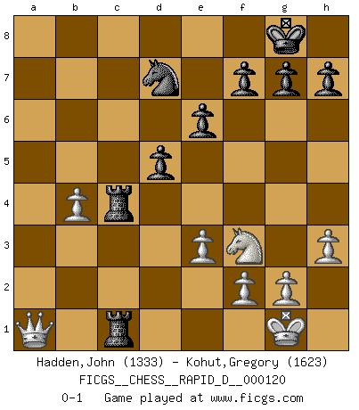 Last move : 0-1 2019 January 15 16:22:8 [Event "FICGS__CHESS__RAPID_D__000120"] [Site "FICGS"] [Date "2018.12.02"] [Round "1"] [White "Hadden,John"] [Black "Kohut,Gregory"] [Result "0-1"] [WhiteElo "1333"] [BlackElo "1623"] 1.d4 Nf6 2.Nf3 e6 3.Nc3 d5 4.Bg5 Be7 5.Bxf6 Bxf6 6.e3 O-O 7.Bd3 c5 8.dxc5 Nd7 9.b4 Bxc3+ 10.Nd2 Bxa1 11.Qxa1 a5 12.c3 axb4 13.cxb4 Qc7 14.O-O b6 15.cxb6 Qxb6 16.a3 Ba6 17.Bxa6 Qxa6 18.Nb1 Rfc8 19.h3 Rc2 20.Qd4 Rac8 21.Nd2 Qxa3 22.Nf3 R8c4 23.Ra1 Qxa1+ 24.Qxa1 Rc1+ 0-1 Queen's pawn game Kingside Castling by player Black (move 6) Kingside Castling by player White (move 14) Player Black won this chess game. Follow this game move after move (download)Though most people love to look at the games of the great attacking masters, some of the most successful players in history have been the quiet positional players. They slowly grind you down by taking away your space, tying up your pieces, and leaving you with virtually nothing to do ! (Yasser Seirawan) Nicht daß Diemer aus Opportunismus Mitglied der NSDAP geworden wäre. Er war ein Fanatiker, in allem, was er tat. (Hans Ree) El Ajedrez es un invernadero donde los frutos del carácter pueden madurar mas completamente que en la vida. (Edward Morgan Foster) Même si vous avez un bon coup à faire, regardez toujours s'il n'y en a pas un qui lui soit préférable. (Pedro Damiano) Animated gif is worth one mega-word. (Unknown)