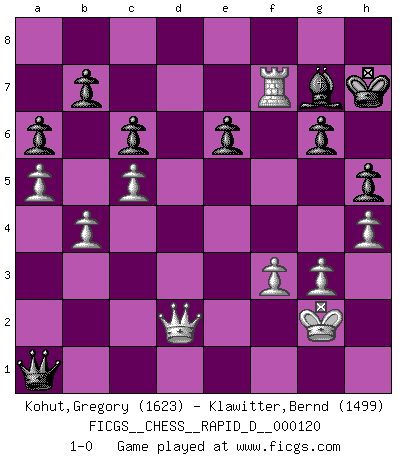 Last move : 1-0 2019 February 11 2:3:38 [Event "FICGS__CHESS__RAPID_D__000120"] [Site "FICGS"] [Date "2018.12.02"] [Round "1"] [White "Kohut,Gregory"] [Black "Klawitter,Bernd"] [Result "1-0"] [WhiteElo "1623"] [BlackElo "1499"] 1.e4 c6 2.d4 d5 3.Nc3 dxe4 4.Nxe4 Bf5 5.Ng3 Bg6 6.Nf3 Nd7 7.h4 h6 8.Bd3 Bxd3 9.Qxd3 Qc7 10.O-O e6 11.Re1 Ngf6 12.Bd2 Be7 13.c4 O-O 14.b4 Rfe8 15.a4 a6 16.Ne4 Nxe4 17.Qxe4 Nf6 18.Qd3 Rad8 19.Qc3 Bf8 20.a5 Qb8 21.g3 Qc8 22.Qc2 Ng4 23.Kg2 h5 24.Ng5 g6 25.f3 Nh6 26.Ne4 Kg7 27.Bxh6+ Kxh6 28.Nf6 Rxd4 29.Nxe8 Qxe8 30.Rad1 Qd8 31.Rxd4 Qxd4 32.Rd1 Qf6 33.c5 Bg7 34.Rd7 Qa1 35.Qd2+ Kh7 36.Rxf7 1-0 Caro-Kann : Classical variation Kingside Castling by player White (move 10) Kingside Castling by player Black (move 13) Player White won this chess game. Follow this game move after move (download)Dazzling combinations are for the many, shifting wood is for the few. (Georg Kieninger) Viele Opfer benötigen überhaupt keine konkrete Berechnung. Es genügt sich die entstehende Position kurz vorzustellen, um uns davon zu überzeugen, dass das Opfer korrekt ist. (Mikhail Nekhemyevich Tal) Las Aperturas te enseñan aperturas. ¡Los Finales te enseñan Ajedrez!. (Stephan Gerzadowicz) Le plus grand jeu de l'esprit jamais inventé, plus vous l'apprenez, plus vous y prenez du plaisir. (Garry Kasparov) Life is like internet, nothing interesting, but noone want to leave it. (Ilmars Cirulis)
