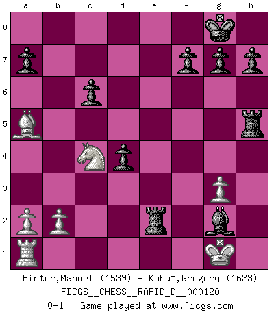 Last move : 0-1 2018 December 22 23:43:54 [Event "FICGS__CHESS__RAPID_D__000120"] [Site "FICGS"] [Date "2018.12.02"] [Round "1"] [White "Pintor,Manuel"] [Black "Kohut,Gregory"] [Result "0-1"] [WhiteElo "1539"] [BlackElo "1623"] 1.e4 c5 2.f4 Nc6 3.Nf3 e6 4.Bc4 d5 5.exd5 exd5 6.Bb5 Bd6 7.Ne5 Nge7 8.O-O O-O 9.Nxc6 Nxc6 10.Qh5 c4 11.Bxc6 bxc6 12.d3 cxd3 13.cxd3 Re8 14.f5 Qb6+ 15.Kh1 Qf2 16.Qd1 Qh4 17.g3 Bxg3 18.Qc2 Bxf5 19.Qg2 Bxd3 20.Qxg3 Qxg3 21.hxg3 Bxf1 22.Bd2 Re2 23.Bc3 Rae8 24.Nd2 Bg2+ 25.Kg1 d4 26.Ba5 R8e5 27.Nc4 Rh5 0-1 Sicilian : Grand Prix attack Kingside Castling by player White (move 8) Kingside Castling by player Black (move 8) Player Black won this chess game. Follow this game move after move (download)I prefer to lose a really good game than to win a bad one. (David Levy) Ich hatte Zahnschmerzen im ersten Spiel. In der zweiten Partie tat mir der Kopf weh. In der dritten war es eine Rheuma-Attacke und während der vierten fühlte ich mich nicht gut. Und in der fünften? Nun, man muss doch nicht jedes Spiel gewinnen, oder? (Savielly Grigorievitsch Tartakower) El hombre es un frívolo, una creatura engañosa y como un jugador de Ajedrez, se preocupa mas por el proceso de obtener su meta que de la meta por sí misma. (Dostoyevsky) Les ravages du H expliquent la différence de niveau entre Tal et Thal [Abergel]. I find your interest interesting. (Gregory House, House M.D.)