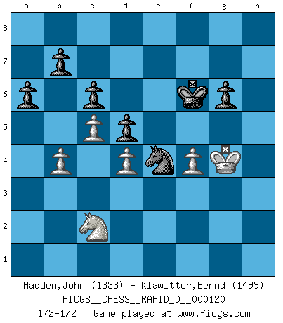 Last move : 1/2-1/2 2019 February 2 22:36:47 [Event "FICGS__CHESS__RAPID_D__000120"] [Site "FICGS"] [Date "2018.12.02"] [Round "1"] [White "Hadden,John"] [Black "Klawitter,Bernd"] [Result "1/2-1/2"] [WhiteElo "1333"] [BlackElo "1499"] 1.d4 d5 2.c4 e5 3.e3 exd4 4.exd4 Bb4+ 5.Bd2 Bxd2+ 6.Nxd2 Nf6 7.Ngf3 O-O 8.b3 c6 9.Bd3 Bg4 10.O-O Nbd7 11.h3 Bh5 12.Be2 Qc7 13.c5 Bg6 14.b4 Rae8 15.Re1 h6 16.Nb3 a6 17.Bd3 Bxd3 18.Qxd3 Ne4 19.Nfd2 Ndf6 20.f3 Nxd2 21.Nxd2 Rxe1+ 22.Rxe1 Re8 23.Rxe8+ Nxe8 24.Qf5 Nf6 25.g4 Qd7 26.Qxd7 Nxd7 27.f4 f6 28.Nf3 Kf7 29.Kg2 g6 30.Kg3 Nf8 31.h4 Kg7 32.g5 hxg5 33.hxg5 Ne6 34.gxf6+ Kxf6 35.Kg4 Ng7 36.Ne5 Nf5 37.Nf3 Ne3+ 38.Kg3 Nc2 39.a3 Nxa3 40.Ne1 Nb5 41.Nc2 Nc3 42.Kg4 Ne4 1/2-1/2 QGD : Albin counter-gambit Kingside Castling by player Black (move 7) Kingside Castling by player White (move 10) This chess game ended in a draw. Follow this game move after move (download)Examine moves that smite! A good eye for smites is far more important than a knowledge of strategical principles. (Purdy) Ich bin es gewohnt, das die Jugend mir überhaupt keinen Respekt entgegenbringt. (Alexander Morozewich) EL Ajedrez es como la vida. (Boris Spassky) Les échecs, c'est l'art d'analyser. (Mikhail Botvinnik) It is not enough to be a good player... you must also play well. (Siegbert Tarrasch)