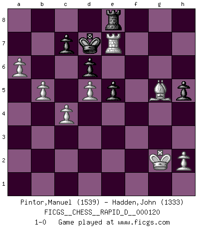 Last move : 1-0 2019 January 17 1:9:44 [Event "FICGS__CHESS__RAPID_D__000120"] [Site "FICGS"] [Date "2018.12.02"] [Round "1"] [White "Pintor,Manuel"] [Black "Hadden,John"] [Result "1-0"] [WhiteElo "1539"] [BlackElo "1333"] 1.e4 e5 2.f4 Nc6 3.Nf3 d6 4.Bb5 Bd7 5.O-O Be7 6.Bc4 Be6 7.Bb5 a6 8.Ba4 Nf6 9.Ng5 h6 10.Nxe6 fxe6 11.Nc3 exf4 12.d4 e5 13.d5 b5 14.Nxb5 axb5 15.Bxb5 O-O 16.Bxc6 Ra7 17.Qf3 Qb8 18.g3 fxg3 19.Qxg3 Nxe4 20.Qg4 Qb6+ 21.Kg2 Rxf1 22.Qxe4 Qf2+ 23.Kh3 Qf3+ 24.Qxf3 Rxf3+ 25.Kg2 Rf5 26.Be3 Ra6 27.Bd7 Rf7 28.Be6 Kf8 29.Bxf7 Kxf7 30.c4 Ke8 31.a4 Kd7 32.b4 Kc8 33.a5 Kb7 34.b5 Ra8 35.a6+ Kb8 36.Rf1 Kc8 37.Rf7 Kd7 38.Rxg7 h5 39.Bg5 Re8 40.Rxe7+ 1-0 King's gambit Kingside Castling by player White (move 5) Kingside Castling by player Black (move 15) Player White won this chess game. Follow this game move after move (download)Chess is thirty to forty percent psychology. You don't have this when you play a computer. I can't confuse it. (Judith Polgar) Das Schachspiel ist ein See, in welchem eine Mücke baden und ein Elefant ertrinken kann. (Emanuel Lasker) No hay otro maestro que tenga una voluntad terrífica de ganar. Al tablero, el irradía peligro y aún los oponentes mas fuertes tienden a congelarse como liebres cuando olfatean a una pantera. Aún sus debilidades son peligrosas. Con las blancas, su juego de apertura es predecible - te es posible hacer planes en su contra - pero es tan fuerte que tus planes casi nunca funcionan. En el juego medio, su precisión e invención son fabulosas y en finales, tú simplemente no le puedes vencer. (Experto Alemán anónimo) Pour moi, les échecs ne sont pas un jeu mais un art. (Alexandre Alekhine) When you have everything, sometimes it feels like nothing. (Horatio Caine, C.S.I. Miami)