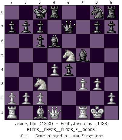 Last move : 0-1 2007 August 30 0:14:6 [Event "FICGS__CHESS__CLASS_E__000051"] [Site "FICGS"] [Date "2007.05.26"] [Round "1"] [White "Wawer,Tom"] [Black "Pech,Jaroslav"] [Result "0-1"] [WhiteElo "1300"] [BlackElo "1433"] 1.e4 e5 2.Nf3 Nc6 3.Bb5 f5 4.Bxc6 dxc6 5.d4 fxe4 6.Nxe5 Qh4 7.O-O Bd6 8.Nc3 Bf5 9.f3 O-O-O 10.g3 Qe7 0-1 Ruy Lopez : Schliemann defense Kingside Castling by player White (move 7) Queenside Castling by player Black (move 9) Player Black won this chess game. Follow this game move after move (download)Chess is thirty to forty percent psychology. You don't have this when you play a computer. I can't confuse it. (Judith Polgar) Das Blackmar-Diemer-Gambit verändert den ganzen Menschen! (Emil Joseph Diemer) Me gusta decir que Bobby Fischer fue el mejor jugador que jamás haya existido. Pero lo que hizo de Fischer un genio, fue su habilidad de mezclar una frescura y pragmatismo Americano con ideas Rusas acerca de la estrategia. (Bruce Pandolfini) En blitz, le Cavalier l'emporte sur le Fou. (Vlastimil Hort) If things go wrong, don't go with them. (Roger Babson)