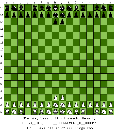 Last move : 0-1 2019 January 3 4:4:30 [Event "FICGS__BIG_CHESS__TOURNAMENT_B__000011"] [Site "FICGS"] [Date "2018.12.03"] [Round "1"] [White "Sternik,Ryszard"] [Black "Pareschi,Remo"] [Result "0-1"] [WhiteElo ""] [BlackElo ""] 0-1 This big chess game has been lost on time (started : 2018.12.03 18:45:24) Follow this game move after move (download)He who takes the Queen's Knight's Pawn will sleep in the streets. (Anonymous) Über Karpov: Er war und ist ein Vertreter der russischen Reaktionäre. Das steckt tief in seiner Seele, wehalb ich nicht nett mit ihm umgehen kann. (Viktor Kortschnoi) Todo lo que importa ante el tablero de Ajedrez son buenas jugadas. (Bobby Fischer) Les écrivains ont utilisé les échecs pour analyser les côtés extrêmes de la nature humaine. Dans ce cadre, les échecs offrent un champ d'expérimentation idéal. Mais on pourrait faire la même chose avec la peinture. Et là, en vous référant à Van Gogh, vous ne tirerez pas de conclusion définitive sur les peintres. (Gary Kasparov) You cannot beat a roulette table unless you steal money from it. (Albert Einstein)
