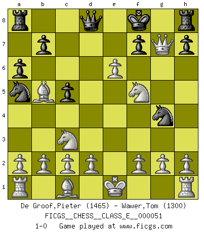 Last move : 1-0 2007 May 29 21:35:10 [Event "FICGS__CHESS__CLASS_E__000051"] [Site "FICGS"] [Date "2007.05.26"] [Round "1"] [White "De Groof,Pieter"] [Black "Wawer,Tom"] [Result "1-0"] [WhiteElo "1465"] [BlackElo "1300"] 1.e4 c5 2.Nc3 e5 3.Bc4 Nf6 4.Nf3 Nc6 5.Ng5 d5 6.exd5 Na5 7.Bb5+ Bd7 8.Qe2 Bd6 9.Nge4 a6 10.Nxd6+ Ke7 11.Qxe5+ Be6 12.Nf5+ Kf8 13.dxe6 Ng4 14.Qxg7+ 1-0 Sicilian : Closed Player White won this chess game. Follow this game move after move (download)The only thing Chess players have in common is Chess. (Lodewijk Prins) Es ist nicht das erste mal, dass sich die FIDE dem Arabischen Geld gebeugt hat (über die FIDE WM 2004 in Lybien). (Larry Evans) Te sientas frente a un tablero y repentinamente tu corazón brinca. Tu mano tiembla al tomar una pieza y moverla. Pero lo que el Ajedrez te enseña es que tu debes permanecer ahí con calma y pensar de que si realmente es una buena idea o de que si hay otras ideas mejores. (Stanley Kubrick) Les Echecs ne sont pas pour les âmes timides. Ils requièrent un homme entier, qui ne s'arrête pas aveuglément à ce qui a été déjà établi, mais qui tente individuellement de sonder les profondeurs du jeu. (W. Steinitz) The Movers & Shakers of this world are those who play chess in the mornings and go to the disco in the evenings. (Dinesh De Silva)