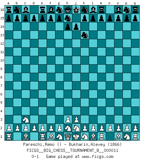 Last move : 0-1 2019 January 22 6:45:16 [Event "FICGS__BIG_CHESS__TOURNAMENT_B__000011"] [Site "FICGS"] [Date "2018.12.03"] [Round "1"] [White "Pareschi,Remo"] [Black "Bukharin,Alexey"] [Result "0-1"] [WhiteElo ""] [BlackElo "1866"] 1.b1-c3 j15-k13 0-1 This big chess game has been lost on time (started : 2018.12.03 18:45:24) Follow this game move after move (download)Chess is a foolish expedient for making idle people believe they are doing something very clever when they are only wasting their time. (George Bernard Shaw) Versuche, dich von der Sklaverei der Eröffnungsvarianten zu befreien. Stattdessen soll man gewisse Typenpositionen erlernen, die man eingehend analysiert. (Aaron Nimzowitsch) Yo jugué Ajedrez con el y a veces le pude haber ganado solo que siempre devuelve su última jugada y juega la partida de manera diferente. (Mark Twain) Avant la finale, les dieux ont créé le milieu de partie. (Tarrasch) The worth of a book is to be measured by what you can carry away from it. (James Bryce)