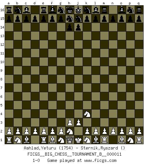 Last move : 1-0 2019 January 3 4:4:30 [Event "FICGS__BIG_CHESS__TOURNAMENT_B__000011"] [Site "FICGS"] [Date "2018.12.03"] [Round "1"] [White "Aahlad,Yeturu"] [Black "Sternik,Ryszard"] [Result "1-0"] [WhiteElo "1754"] [BlackElo ""] 1.j2-k4 1-0 This big chess game has been lost on time (started : 2018.12.03 18:45:24) Follow this game move after move (download)One doesn't have to play well, it's enough to play better than your opponent. (Siegbert Tarrasch) Ich verlor meine Bürgerrechte, mein Gehalt wurde mir nicht mehr bezahlt und ich wurde zensiert und durfte nicht mehr ins Ausland reisen. [nach dem Match Fischer-Taimanov 6:0] (Mark Taimanov) No solamente yo pronostico su triunfo sobre Botvinnik, sino que me adelanto y digo que probablemente Fischer es el jugador de Ajedrez mas grande que haya existido. (John Collins) Celui qui prend des risques peut perdre, celui qui n'en prend pas perd toujours. (Xavier Tartacover) There are three kinds of lies: lies, damned lies and statistics. (Mark Twain)