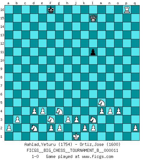 Last move : 1-0 2019 June 11 1:10:23 [Event "FICGS__BIG_CHESS__TOURNAMENT_B__000011"] [Site "FICGS"] [Date "2018.12.03"] [Round "1"] [White "Aahlad,Yeturu"] [Black "Ortiz,Jose"] [Result "1-0"] [WhiteElo "1754"] [BlackElo "1600"] 1.j2-k4 n15-n13 2.h1-o7 g15-g14 3.o7-o15 p16-o14 4.o15-l12 j15-k13 5.h2-g4 m15-m13 6.l12-c12 e15-e14 7.c12-c15 b16-c14 8.c15-j9 o16-m14 9.e2-e4 d15-d14 10.f1-b5 l16-m15 11.n2-n4 h15-j13 12.m2-m4 j13-k11 13.j9-j10 k13-h12 14.j10-d5 c16-d15 15.b5-m15 o14-m15 16.o1-g8 h16-n11 17.k1-l3 k11-h10 18.g8-m13 l15-l14 19.m13-h9 e14-e13 20.l1-p5 m14-j11 21.d2-d4 n11-o11 22.p5-j11 o11-j11 23.m1-m3 d15-j10 24.h9-j10 h12-j10 25.m3-p3 h10-k9 26.p3-p15 k9-m8 27.d5-f5 q16-o16 28.f5-f15 g16-j15 29.f15-b15 c14-e15 30.p1-o3 o16-o12 31.c1-o12 j11-o16 32.o12-q14 o16-o14 33.q14-p13 o14-p15 34.p13-m16 p15-p2 35.q1-m1 p2-o3 36.b15-j8 o3-o10 37.o2-o4 j10-l9 38.j8-l8 m8-n10 39.k4-m5 l9-m11 40.l8-l10 o10-n11 41.m16-h12 m11-k12 42.l10-h10 g14-g13 43.h12-n7 l14-l13 44.e1-e3 a16-b16 45.e3-b3 n11-d2 46.b1-d2 h14-h13 47.h10-n10 h13-h12 48.b3-b16 e16-b16 49.b2-b3 b16-b4 50.g1-f3 f16-j13 51.n10-q10 b4-b7 52.q10-q15 b7-c7 53.q15-j8 j13-h14 54.j8-d8 c7-c2 55.d8-d14 h14-f16 56.d14-e13 g13-g12 57.e13-e12 k16-h15 58.n7-h12 j14-j13 59.h12-e15 c2-c16 60.e15-f16 c16-f16 61.e12-g12 f16-g16 62.g12-j12 m15-k14 63.j12-n16 k14-l16 64.n16-n13 l13-l12 65.a1-c1 k12-l14 66.n13-n10 l12-l11 67.c1-c15 a15-a13 68.n10-h15 j16-k16 69.c15-c13 a13-a12 70.c13-c12 g16-j16 71.c12-a12 l16-k14 72.h15-m11 k16-l15 73.m1-p1 j16-m16 74.p1-p15 l15-l16 75.a12-a16 l14-k16 76.a16-k16 l16-k16 77.m11-m16 k14-l16 78.m16-l15 k16-j16 79.l15-k15 j16-h16 80.k15-k16 h16-h15 81.k16-l16 h15-h14 82.l16-h16 h14-j14 83.h16-j15 j14-h13 84.p15-p12 h13-g14 85.j15-j13 g14-f14 86.p12-p14 f14-e15 87.j13-l15 e15-f16 88.p14-p16 1-0 Follow this game move after move (download)Any material change in a position must come about by mate, a capture, or a Pawn promotion. (Purdy) Die Jungen erwarten, dass Opa einfach umfällt. Dann aber kann Opa fünf Stunden lang Schach spielen und die jungen Gegner an die Wand drücken. (Viktor Kortschnoi) En posiciones complicadas, Bobby Fischer pocas veces tuvo que temer de cualquiera. (Paul Keres) Le temps de noter son nom sur la feuille de partie, j'étais déjà en zeitnot ! D'un modeste amateur apparié lors de la première ronde d'un open contre le grand-maître Azmaïparashvili. Computers make it easier to do a lot of things, but most of the things they make it easier to do don't need to be done. (Andy Rooney)
