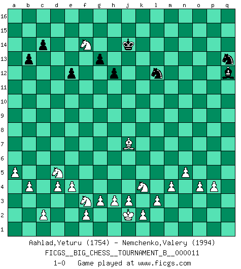 Last move : 1-0 2019 May 12 7:19:25 [Event "FICGS__BIG_CHESS__TOURNAMENT_B__000011"] [Site "FICGS"] [Date "2018.12.03"] [Round "1"] [White "Aahlad,Yeturu"] [Black "Nemchenko,Valery"] [Result "1-0"] [WhiteElo "1754"] [BlackElo "1994"] 1.j2-k4 q15-q13 2.h1-o7 j15-h13 3.o7-o15 p16-o14 4.o15-l12 k16-l14 5.h2-g4 m15-m13 6.l12-c12 b16-c14 7.c12-f15 g16-f14 8.m2-m4 l16-o13 9.e2-e4 n15-n13 10.d2-d4 h15-g13 11.f15-g14 j16-j15 12.c1-l9 c14-e13 13.g14-c10 g13-e14 14.m1-m3 g15-g14 15.l1-o4 f14-g12 16.m3-k3 k15-k13 17.c10-o10 l14-m12 18.l9-n11 o13-n12 19.o4-j9 l15-l13 20.o10-q8 o14-p12 21.n11-p9 j15-h15 22.q2-q4 o16-n15 23.q1-q3 m12-o11 24.p9-m6 f16-g15 25.q3-o3 m16-o16 26.o3-o6 g15-f14 27.o6-o8 l13-l12 28.q8-h16 e16-h16 29.f1-a6 h13-j11 30.n2-n4 d15-d13 31.o1-j6 c16-d15 32.a6-d9 m13-m12 33.k3-o3 o11-m10 34.o8-o16 h16-o16 35.o3-o16 q16-o16 36.p1-o3 p12-n11 37.j6-q13 p15-p13 38.q13-k7 m10-k9 39.e1-e3 l12-l11 40.e3-b3 b15-b13 41.k7-d13 c15-c14 42.d13-j8 l11-l10 43.b1-c3 k13-k12 44.g1-f3 p13-p12 45.k1-l3 n11-m9 46.l3-m5 k12-k11 47.m6-o4 k11-k10 48.j9-m6 h14-h13 49.o3-p5 g12-h10 50.j8-f5 e14-f12 51.o2-o3 e13-d11 52.m6-h10 k9-h10 53.o4-h10 e15-e13 54.b3-b6 h15-h14 55.b6-p6 o16-p16 56.p6-o6 p16-p15 57.j1-j2 j14-j13 58.a1-q1 d11-f10 59.d9-f7 d15-e14 60.o6-o15 p15-o15 61.f7-o15 n15-k12 62.m5-l7 m9-l7 63.h10-l7 j11-k9 64.l7-p11 k12-m14 65.g4-j5 j13-j12 66.p11-n9 h14-j14 67.o15-n14 n12-o11 68.f5-g4 n13-n12 69.n14-p12 a16-o16 70.p12-o11 n12-o11 71.j5-l6 o11-o10 72.n9-k6 f10-h9 73.g4-k7 k9-j11 74.k6-a15 m12-m11 75.l6-n7 m14-q10 76.n7-o9 q10-o12 77.a2-a4 e14-d13 78.a15-k6 o12-l9 79.b2-b4 k10-k9 80.p2-p4 m11-m10 81.o3-o4 m10-m9 82.q4-q5 h9-k10 83.k7-d13 f12-d13 84.k6-m8 j11-h9 85.m8-l9 f14-j11 86.c3-d5 d13-f12 87.a4-a5 g14-g13 88.q5-q6 j11-h10 89.p5-n6 j12-j11 90.q6-q7 k10-l8 91.q7-q8 l8-n9 92.n4-n5 h13-h12 93.q8-q9 n9-o11 94.q9-q10 j11-j10 95.q10-q11 o11-q12 96.l9-n11 o16-o13 97.q1-q10 h10-m14 98.q10-o10 h9-j11 99.o10-o13 q12-o13 100.n11-p13 j11-l12 101.n6-m8 l12-j11 102.q11-q12 f12-h13 103.q12-q13 m14-o16 104.o9-n11 o13-q14 105.m8-l10 j11-k13 106.n11-m9 k13-m14 107.l10-m12 m14-o15 108.m12-n14 o16-g9 109.p13-k8 e13-e12 110.l2-l3 h13-k12 111.m9-l11 k12-l14 112.l11-j10 g9-k6 113.g2-g3 k6-q12 114.j10-l11 l14-n13 115.l11-k9 n13-p12 116.k9-h10 p12-o14 117.n14-m16 o14-q13 118.m16-o15 q14-o15 119.k8-j7 o15-n13 120.h10-g12 n13-l12 121.g12-f14 1-0 Follow this game move after move (download)One bad move nullifies forty good ones. (Horowitz) Nicht daß Diemer aus Opportunismus Mitglied der NSDAP geworden wäre. Er war ein Fanatiker, in allem, was er tat. (Hans Ree) La mitad de las variaciones que son calculadas en una partida de torneo, resultan ser completamente superfluas. Desafortunadamente, nadie sabe por adelantado cual mitad. (Jan Tinman) J'ai toujours senti une vague pitié pour l'homme qui ne connaît rien aux échecs, tout comme j'en aurais pour un homme ignorant de l'amour. Les Echecs, comme la musique ou comme l'amour, ont le pouvoir de rendre heureux. (Siegbert Tarrasch) Life is like a play: it's not the length but the excellence of the acting that matters. (Seneca)