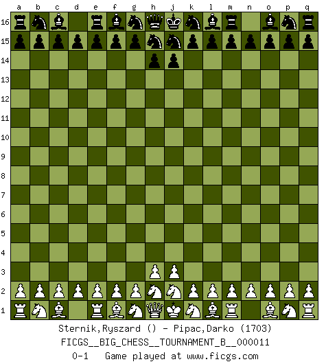 Last move : 0-1 2019 January 3 4:4:30 [Event "FICGS__BIG_CHESS__TOURNAMENT_B__000011"] [Site "FICGS"] [Date "2018.12.03"] [Round "1"] [White "Sternik,Ryszard"] [Black "Pipac,Darko"] [Result "0-1"] [WhiteElo ""] [BlackElo "1703"] 0-1 This big chess game has been lost on time (started : 2018.12.03 18:45:24) Follow this game move after move (download)I feel as if I were a piece in a game of Chess, when my opponent says of it: That piece cannot be moved. (Soren Kierkegaard) Viele Opfer benötigen überhaupt keine konkrete Berechnung. Es genügt sich die entstehende Position kurz vorzustellen, um uns davon zu überzeugen, dass das Opfer korrekt ist. (Mikhail Nekhemyevich Tal) Juega la Apertura como un libro, el Juego Medio como un mago y los Finales como una máquina. (Spielmann) Pour moi, les échecs ne sont pas un jeu mais un art. (Alexandre Alekhine) There is far too much law for those who can afford it and far too little for those who cannot. (Derek Bok)