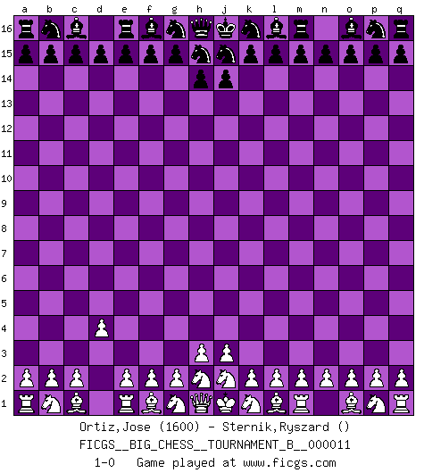 Last move : 1-0 2019 January 4 4:9:36 [Event "FICGS__BIG_CHESS__TOURNAMENT_B__000011"] [Site "FICGS"] [Date "2018.12.03"] [Round "1"] [White "Ortiz,Jose"] [Black "Sternik,Ryszard"] [Result "1-0"] [WhiteElo "1600"] [BlackElo ""] 1.d2-d4 1-0 This big chess game has been lost on time (started : 2018.12.03 18:45:24) Follow this game move after move (download)It is no time to be playing Chess when the house is on fire. (Italian Proverb) Die Partien sind immer verschieden, die Interviews immer die gleichen. (Garry Kasparov) Desconfianza es la característica mas necesaria de un jugador de Ajedrez. (Siegbert Tarrasch) Les Echecs, c'est l'art de la guerre sans les charniers, c'est la résurrection des morts tombés au champ d'honneur, l'espoir perpétuel, la suprématie de l'intelligence sur la force, la culture de l'esprit. (F. Szpiner) When the going gets tactical, the computers get going. (Hyatt)