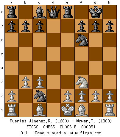 Last move : 0-1 2007 June 1 0:12:42 [Event "FICGS__CHESS__CLASS_E__000051"] [Site "FICGS"] [Date "2007.05.26"] [Round "1"] [White "Fuentes Jimenez,Roberto"] [Black "Wawer,Tom"] [Result "0-1"] [WhiteElo "1600"] [BlackElo "1300"] 1.b3 e5 2.d4 exd4 3.Qxd4 Nc6 4.Qe4+ Be7 5.Nc3 Nf6 6.Qe3 d5 7.Nf3 O-O 8.Nb1 Re8 9.Nc3 d4 10.Qd3 dxc3 11.Qxc3 Bb4 12.Qxb4 Nxb4 13.c3 Nc2+ 0-1 Nimzovich-Larsen attack : Modern variation Kingside Castling by player Black (move 7) Player Black won this chess game. Follow this game move after move (download)Only sissies Castle. (Rob Sillars) Ich könnte leicht behaupten: Ja,ja, Leonid Breschnew wollte nicht, daß ich Weltmeister werde. In der Tat war die Sache komplizierter. (Viktor Kortschnoi) Debemos de asegurarnos de que el Ajedrez no se convierta en un lenguaje muerto, muy interesante, pero tan solo para un grupo muy pequeño. (Sytze Faber) Si le désir cupide (et stupide) de gagner est une inépuisable source de souffrance, une combinaison brillante sur l'échiquier est une découverte : le coquelicot qui s'épanouit lorsque apparaît la Voie Lactée. (Arrabal) History is a gallery of pictures in which there are few originals and many copies. (Alexis de Tocqueville)
