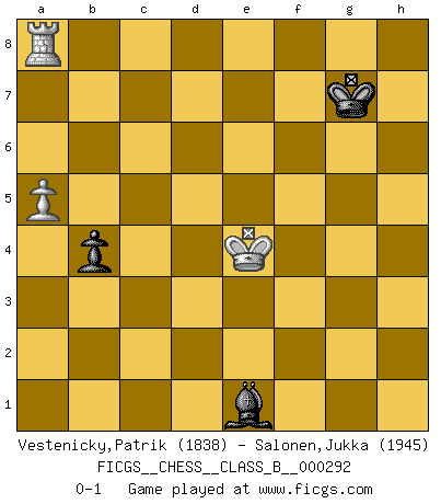Last move : 0-1 2019 July 23 8:7:40 [Event "FICGS__CHESS__CLASS_B__000292"] [Site "FICGS"] [Date "2018.12.05"] [Round "1"] [White "Vestenicky,Patrik"] [Black "Salonen,Jukka"] [Result "0-1"] [WhiteElo "1838"] [BlackElo "1945"] 1.d4 d5 2.c4 e6 3.Nc3 Nf6 4.cxd5 exd5 5.Bg5 Be7 6.Qc2 c6 7.Nf3 g6 8.e4 dxe4 9.Bxf6 Bxf6 10.Qxe4+ Qe7 11.O-O-O Be6 12.Nd2 Bf5 13.Qxe7+ Kxe7 14.Nc4 Rd8 15.Ne3 Be6 16.d5 Bxc3 17.dxe6 Rxd1+ 18.Nxd1 Ba5 19.exf7 Nd7 20.h4 Kxf7 21.h5 Kg7 22.Rh3 Bb6 23.Bd3 Rf8 24.f3 Bc7 25.Nc3 Nc5 26.Bc2 Re8 27.Rh4 g5 28.h6+ Kf6 29.Rh1 Re7 30.b4 Be5 31.Nd1 Nd7 32.Nf2 Ke6 33.a3 Nf6 34.Kb1 Kd5 35.Re1 c5 36.bxc5 Kxc5 37.g4 Kc4 38.f4 gxf4 39.g5 Nd7 40.Ng4 f3 41.Bxh7 Rxh7 42.g6 Rxh6 43.Nxh6 f2 44.Rc1+ Kd5 45.Ng4 Bh8 46.Nxf2 Ne5 47.Rg1 Bg7 48.Ng4 Nxg4 49.Rxg4 Ke5 50.Rg2 Kf6 51.a4 b6 52.Kc2 Kf5 53.Kd3 Kf6 54.Rg1 Bh6 55.Kd4 a6 56.Rg2 Kg7 57.Rc2 b5 58.a5 Kxg6 59.Rc6+ Kg7 60.Rxa6 Bd2 61.Ra8 Be1 62.Ke4 b4 0-1 QGD : Exchange, positional line Queenside Castling by player White (move 11) 10 pieces endgame at move 46 : White KRNPP , Black KBNPP WHITE : King + 1 Rook 1 Knight 2 Pawns BLACK : King + 1 Bishop 1 Knight 2 Pawns 9 pieces endgame at move 48 : White KRPP , Black KBNPP WHITE : King + 1 Rook 2 Pawns BLACK : King + 1 Bishop 1 Knight 2 Pawns 8 pieces endgame at move 49 : White KRPP , Black KBPP WHITE : King + 1 Rook 2 Pawns BLACK : King + 1 Bishop 2 Pawns 7 pieces endgame at move 58 : White KRP , Black KBPP WHITE : King + 1 Rook 1 Pawn BLACK : King + 1 Bishop 2 Pawns 6 pieces endgame at move 60 : White KRP , Black KBP WHITE : King + 1 Rook 1 Pawn BLACK : King + 1 Bishop 1 Pawn Player Black won this chess game. Follow this game move after move (download)What is the object of playing a gambit opening?... To acquire a reputation of being a dashing player at the cost of losing a game. (Siegbert Tarrasch) Es liegt in der Natur, vernüftig zu denken und unlogisch zu handeln. (Anatole France) El Ajedrez, como cualquier actividad creativa, solo puede existir a través del esfuerzo combinado de aquellos que tienen talento creativo y de aquellos que poseen la habilidad de organizar su trabajo creativo. (Mikhail Botvinnik) Le profane ne songe pas à la somme de jouissance dont il se prive, qui méconnaît ce jeu aux ressources aussi variées que passionnantes. (Jean-Marie Jeanton-Lamarche) Man is reluctant to give credit for intelligence to anyone, except his enemies. (Albert Einstein)