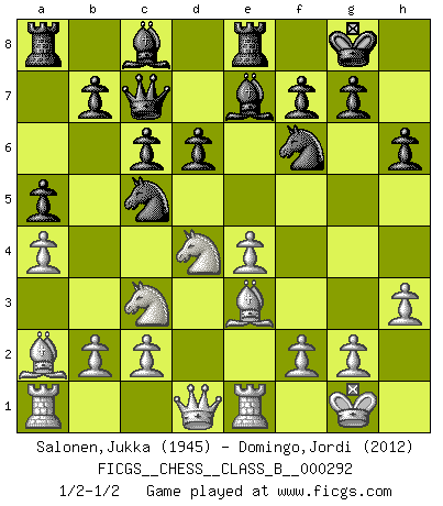 Last move : 1/2-1/2 2019 March 18 7:17:46 [Event "FICGS__CHESS__CLASS_B__000292"] [Site "FICGS"] [Date "2018.12.05"] [Round "1"] [White "Salonen,Jukka"] [Black "Domingo,Jordi"] [Result "1/2-1/2"] [WhiteElo "1945"] [BlackElo "2012"] 1.e4 e5 2.Nf3 d6 3.d4 Nf6 4.Nc3 Nbd7 5.Bc4 Be7 6.O-O O-O 7.Re1 c6 8.a4 a5 9.h3 Qc7 10.Bg5 exd4 11.Nxd4 h6 12.Be3 Re8 13.Ba2 Nc5 1/2-1/2 Philidor : Improved Hanham variation Kingside Castling by player White (move 6) Kingside Castling by player Black (move 6) This chess game ended in a draw. Follow this game move after move (download)Chess demands total concentration. (Bobby Fischer) Ich liebe den Moment, wenn ich das Ego meines Gegenüber breche. (Robert James Fischer) Si no le temes a Spassky, entonces elimino el elemento del dinero. (Jim Slater) Les échecs, c'est l'art d'analyser. (Mikhail Botvinnik) Work expands to fill the time available. (C. Northcote Parkinson, in Parkinson's Laws)