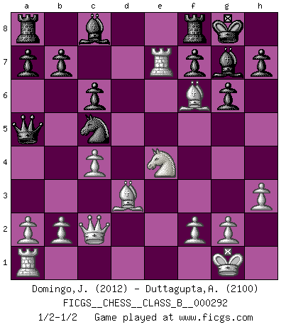 Last move : 1/2-1/2 2019 April 18 17:26:23 [Event "FICGS__CHESS__CLASS_B__000292"] [Site "FICGS"] [Date "2018.12.05"] [Round "1"] [White "Domingo,Jordi"] [Black "Duttagupta,Aniruddha"] [Result "1/2-1/2"] [WhiteElo "2012"] [BlackElo "2100"] 1.e4 d5 2.exd5 Qxd5 3.Nc3 Qd6 4.d4 g6 5.Nf3 Nf6 6.Nb5 Qb6 7.c4 c6 8.Nc3 Bg7 9.h3 O-O 10.Bd3 e5 11.dxe5 Nfd7 12.O-O Nxe5 13.Nxe5 Bxe5 14.Re1 Bg7 15.Qc2 Qc7 16.Bg5 Na6 17.Re7 Qa5 18.Ne4 Nc5 19.Bf6 1/2-1/2 Scandinavian : Pytel-Wade variation Kingside Castling by player Black (move 9) Kingside Castling by player White (move 12) This chess game ended in a draw. Follow this game move after move (download)The sign of a great Master is his ability to win a won game quickly and painlessly. (Irving Chernev) Eine Person mit durchschnittlichem IQ kann etwa eine ELO von 2000 erreichen. (Jonathan Levitt) Tu sabes que vas a perder. Aún cuando tenía la ventaja, yo sabía que iba a perder. - al estar jugando con Fischer (Andrew Soltis) À la honte des hommes, on sait que les lois du jeu sont les seules qui soient partout justes, claires, inviolables et exécutées. Pourquoi l'Indien qui a donné les règles du jeu d'échecs est-il obéi de bon gré dans toute la terre, et que les décrétales des papes, par exemple, sont aujourd'hui un objet d'horreur et de mépris ? C'est que l'inventeur des échecs combina tout avec justesse pour la satisfaction des joueurs, et que les papes, dans leurs décrétales, n'eurent en vue que leur seul avantage. L'Indien voulut exercer également l'esprit des hommes et leur donner du plaisir; les papes ont voulu abrutir l'esprit des hommes. Voltaire (Dictionnaire philosophique / Garnier 1967) Without enthusiasm, virtue functions not at all, and vice only poorly. (Mignon McLaughlin, The Neurotic's Notebook, 1960)