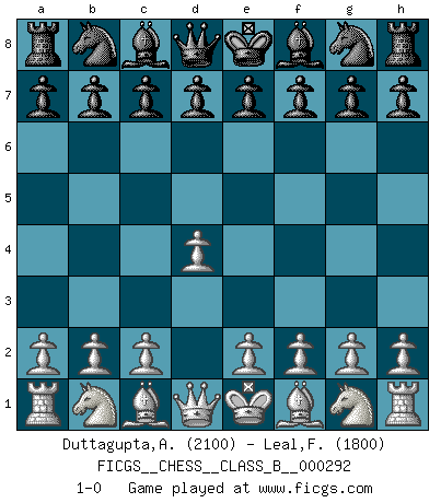Last move : 1-0 2019 January 16 5:58:55 [Event "FICGS__CHESS__CLASS_B__000292"] [Site "FICGS"] [Date "2018.12.05"] [Round "1"] [White "Duttagupta,Aniruddha"] [Black "Leal,Fabrice"] [Result "1-0"] [WhiteElo "2100"] [BlackElo "1800"] 1.d4 1-0 This chess game has been lost on time (started : 2018.12.05 15:13:31) Queen's pawn Player White won this chess game. Follow this game move after move (download)Openings teach you openings. Endgames teach you chess ! (Stephan Gerzadowicz) Es hat in meinem Leben Zeiten gegeben, in denen das Schachspiel, wenn nicht zum Lebenszweck, so doch zu einem regelrechten Lebensersatz geworden ist. Man fühlt sich in solchen Zeiten nicht so, als besäße man eine göttliche Gabe, sondern eher so, als sei man von ihr besessen. (Garry Kasparov) El Ajedrez te enseña a controlarl la excitación inicial que sientes cuando vez algo que parece bueno y te enseña a pensar objetivamente cuando te encuentras en problemas. (Stanley Kubrick) La victoire dans une partie d'Echecs appartient la plupart du temps à celui qui voit un peu plus loin que l'adversaire. (Lasker) Always two there are. No more no less. A master, and an apprentice. (Master Yoda in Star Wars ep.1)