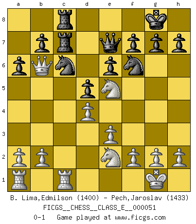 Last move : 0-1 2007 October 15 0:39:28 [Event "FICGS__CHESS__CLASS_E__000051"] [Site "FICGS"] [Date "2007.05.26"] [Round "1"] [White "B. Lima,Edmilson"] [Black "Pech,Jaroslav"] [Result "0-1"] [WhiteElo "1400"] [BlackElo "1433"] 1.d4 d5 2.c4 c6 3.Nc3 Nf6 4.cxd5 cxd5 5.Nf3 Nc6 6.Bf4 Bf5 7.e3 e6 8.Bd3 Bxd3 9.Qxd3 Bd6 10.Bxd6 Qxd6 11.O-O O-O 12.Rfc1 Rfc8 13.Qb5 a6 14.Qb6 Rc7 15.Ne5 Qe7 16.Ne2 Rac8 0-1 QGD Slav defense Kingside Castling by player White (move 11) Kingside Castling by player Black (move 11) Player Black won this chess game. Follow this game move after move (download)In life, as in Chess, one's own Pawns block one's way. A man's very wealth, ease, leisure, children, books, which should help him to win, more often checkmate him. (Charles Buxton) Ich habe Putins Aufstieg an die Macht beobachtet und seine Politik, die demokratischen Institutionen meines Landes zu zerstören. (Garry Kasparov) El Ajedrez expande y enriquece tu mente. (Saudin Robovic) La vie est comme un jeu d'échecs : nous esquissons un plan, mais celui-ci est tributaire de ce que daignent faire l'adversaire aux échecs et le destin dans la vie. (Arthur Schopenhauer) I don't know, I don't care, and it doesn't make any difference. (Albert Einstein)