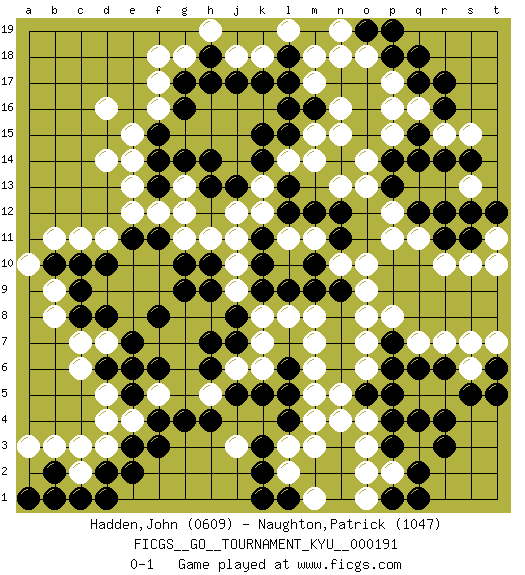 Last move : 0-1 2019 February 21 10:36:48 [Event "FICGS__GO__TOURNAMENT_KYU__000191"] [Site "FICGS"] [Date "2018.12.06"] [Round "1"] [Black "Hadden,John"] [White "Naughton,Patrick"] [Result "0-1"] [Rating 1 "0609"] [Rating 2 "1047"] 1.r4 d4 2.r16 d16 3.g16 d14 4.g4 r10 5.r12 r7 6.r6 q7 7.q6 o4 8.o5 n4 9.l4 n5 10.p5 m7 11.e3 d3 12.d10 c11 13.c10 c7 14.c8 d7 15.d8 d11 16.g9 m17 17.k17 p17 18.q17 p16 19.p18 o18 20.q18 f17 21.g17 f16 22.g14 m14 23.l15 m15 24.m10 o10 25.n12 p12 26.q14 l14 27.k15 g11 28.f11 f12 29.e11 e12 30.g10 h11 31.h10 g13 32.h13 j11 33.k11 j10 34.k10 j9 35.f8 j6 36.j5 k6 37.h6 f5 38.f4 e4 39.f3 q3 40.r3 l3 41.k3 m3 42.k5 o7 43.p7 p8 44.p6 o6 45.q4 j12 46.j13 k12 47.l12 k13 48.k14 o13 49.l13 m11 50.n11 n10 51.m9 l8 52.l9 l11 53.k9 k8 54.p3 o3 55.p4 o8 56.e7 e6 57.f6 g18 58.h18 f18 59.l18 m18 60.l17 b9 61.b10 b8 62.d6 c6 63.e5 d5 64.e6 b11 65.c9 a10 66.d2 c2 67.e2 c3 68.l6 m6 69.j7 k7 70.j8 m8 71.n9 o9 72.m12 n13 73.h9 g12 74.f14 e14 75.f15 e15 76.m16 n16 77.l16 n15 78.q15 p15 79.p14 o14 80.q12 p11 81.p13 q11 82.r11 s10 83.s11 j3 84.k2 l2 85.l1 m1 86.k1 s6 87.s5 s7 88.t6 t7 89.t5 p2 90.q2 o2 91.p1 o1 92.q1 j18 93.j17 h19 94.h17 k18 95.f13 e13 96.h14 l19 97.c1 b1 98.d1 t11 99.t12 t10 100.o19 n18 101.b2 b3 102.a1 n19 103.p19 q16 104.r17 s13 105.s12 r15 106.r14 s15 107.s14 a3 108.b1 m4 109.l5 h5 110.h7 m5 111.h4 pass 0-1 Here are the names of the openings (joseki) played in the four corners : Corner d16 : d16 g16 Hoshi (Hwajeom, Seongjeom, Xingwei`) 4-4 Point. The star or hoshi (4-4) point, emphasizing influence at the potential expense of territory. Niken Takagakari (Dukan Nop'dakeolch'im, E`r Gaojia, 2-Space High Approach). Black 2 is a light approach move. Rarely played in even games, Black 2 is typically employed in handicap games. White continues with 6-4 or 3-10. In Korean Sunjang Baduk White has a stone on 8-4. Corner d4 : d4 g4 Hoshi (Hwajeom, Seongjeom, Xingwei`) 4-4 Point. The star or hoshi (4-4) point, emphasizing influence at the potential expense of territory. Niken Takagakari (Dukan Nop'dakeolch'im, E`r Gaojia, 2-Space High Approach). Black 2 is a light approach move. Rarely played in even games, Black 2 is typically employed in handicap games. White continues with 6-4 or 3-10. In Korean Sunjang Baduk White has a stone on 8-4. Corner q4 : r4 r7 Komoku (Somok, Xiao~mu`) 3-4 Point. The komoku (3-4) point is the traditional corner enclosure move.. Player White won this Go (weiqi, baduk) game. Follow this game move after move (download)There is death in the hane. (Anonymous) The next best thing to gambling and winning is gambling and loosing. (Nick Dandalos)