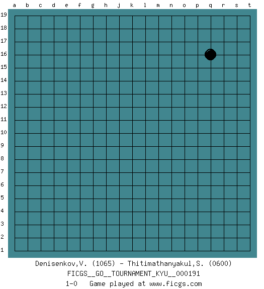 Last move : 1-0 2019 January 8 4:29:0 [Event "FICGS__GO__TOURNAMENT_KYU__000191"] [Site "FICGS"] [Date "2018.12.06"] [Round "1"] [Black "Denisenkov,Valentin"] [White "Thitimathanyakul,Sarote"] [Result "1-0"] [Rating 1 "1065"] [Rating 2 "0600"] 1.q16 1-0 This go game has been lost on time (started : 2018.12.06 12:26:30) Here are the names of the openings (joseki) played in the four corners : Player Black won this Go (weiqi, baduk) game. Follow this game move after move (download)Studying go is a wonderful way to develop both the creative as well as the logical abilities of children because to play it both sides of the brain are necessary. (Cho Chikun) Internal peace cannot coexist with external war. (Don Groves)