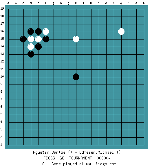 Last move : 1-0 2006 July 22 14:27:2 [Event "FICGS__GO__TOURNAMENT__000004"] [Site "FICGS"] [Date "2006.06.08"] [Round "1"] [Black "Agustin,Santos"] [White "Edmeier,Michael"] [Result "1-0"] 1.k10 e15 2.e14 q16 3.f15 d15 4.e16 d14 5.d16 f16 6.c15 k15 7.d13 1-0 This go game has been lost on time (started : 2006.06.08 14:53:11) Here are the names of the openings (joseki) played in the four corners : Corner d16 : e15 e14 Go-no-go (Wu~wu~) 5-5 Point. The 5-5 was experimented with briefly during the "New Fuseki" movement in Japan in the 1930s. The 5-5 point has not retained popularity because the 4-4 hoshi (star) point strikes a better balance between influence and territory. As one can see from the variations, though, the 5-5 is playable. Player Black won this Go (weiqi, baduk) game. Follow this game move after move (download)More haste less speed. (John Fairbairn) Beep ! (R2D2 in Star Wars ep.3)