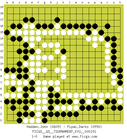 Last move : 1-0 2019 May 1 20:29:15 [Event "FICGS__GO__TOURNAMENT_KYU__000191"] [Site "FICGS"] [Date "2018.12.06"] [Round "1"] [Black "Hadden,John"] [White "Pipac,Darko"] [Result "1-0"] [Rating 1 "0609"] [Rating 2 "0990"] 1.c4 q4 2.r16 d16 3.n4 n5 4.l4 l5 5.h4 q14 6.p16 p15 7.d13 d10 8.f13 g13 9.d11 f11 10.c10 e11 11.c12 f15 12.k16 k15 13.m16 m15 14.r14 r13 15.q15 p13 16.p4 p5 17.r4 r5 18.q3 q5 19.s4 s5 20.d9 e10 21.g8 e9 22.d8 e8 23.e7 f7 24.e6 g6 25.j8 k8 26.h6 j6 27.h5 g7 28.f8 h7 29.h8 j7 30.j10 k10 31.g12 g11 32.h12 h11 33.j11 j9 34.h9 k9 35.h10 j12 36.k12 j13 37.f12 k11 38.e12 f9 39.g10 h13 40.h16 h15 41.g16 g15 42.f16 e15 43.d17 e16 44.e17 j16 45.j17 j15 46.l16 l15 47.o15 p14 48.s14 n15 49.n16 o14 50.o16 d14 51.c14 c15 52.b14 e14 53.c16 b15 54.b16 e13 55.a15 d15 56.s13 r12 57.s12 r11 58.s11 r10 59.s10 r9 60.s9 s8 61.j5 k5 62.k4 o4 63.p3 m4 64.n3 m3 65.m2 l3 66.o3 o5 67.l2 k3 68.j4 j3 69.h3 f4 70.f3 f5 71.e4 e5 72.d5 g3 73.g2 g4 74.j2 g5 75.h2 e3 76.d4 f2 77.d3 e1 78.k2 m5 79.d2 t4 80.s3 d1 81.e2 f3 82.c1 f1 83.c2 f6 84.t3 t5 85.t8 s7 86.t7 t6 87.t9 d7 88.d6 c7 89.c9 b8 90.b9 b5 91.b4 c6 92.b3 a8 93.a9 a5 94.b6 c5 95.c8 b7 96.a6 f14 97.a4 a7 98.g1 d12 99.e12 f12 100.d12 f10 101.b6 g9 102.pass 1-0 Here are the names of the openings (joseki) played in the four corners : Corner q4 : q4 n4 Hoshi (Hwajeom, Seongjeom, Xingwei`) 4-4 Point. The star or hoshi (4-4) point, emphasizing influence at the potential expense of territory. Niken Takagakari (Dukan Nop'dakeolch'im, E`r Gaojia, 2-Space High Approach). Black 2 is a light approach move. Rarely played in even games, Black 2 is typically employed in handicap games. White continues with 6-4 or 3-10. In Korean Sunjang Baduk White has a stone on 8-4. Corner q16 : r16 q14 Komoku (Somok, Xiao~mu`) 3-4 Point. The komoku (3-4) point is the traditional corner enclosure move.. Corner d16 : d16 d13 Hoshi (Hwajeom, Seongjeom, Xingwei`) 4-4 Point. The star or hoshi (4-4) point, emphasizing influence at the potential expense of territory. Niken Takagakari (Dukan Nop'dakeolch'im, E`r Gaojia, 2-Space High Approach). Black 2 is a light approach move. Rarely played in even games, Black 2 is typically employed in handicap games. White continues with 6-4 or 3-10. In Korean Sunjang Baduk White has a stone on 8-4. Player Black won this Go (weiqi, baduk) game. Follow this game move after move (download)Never try to cut bamboo joints. (Anonymous) All art requires courage. (Anne Tucker)