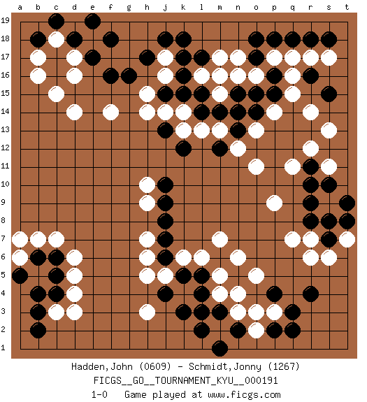 Last move : 1-0 2019 June 25 21:36:49 [Event "FICGS__GO__TOURNAMENT_KYU__000191"] [Site "FICGS"] [Date "2018.12.06"] [Round "1"] [Black "Hadden,John"] [White "Schmidt,Jonny"] [Result "1-0"] [Rating 1 "0609"] [Rating 2 "1267"] 1.r4 d4 2.r16 d16 3.f16 f14 4.g16 j17 5.h17 j16 6.e17 h14 7.c16 c15 8.c17 r12 9.r9 d17 10.d18 h3 11.k3 r14 12.p16 d14 13.l17 e18 14.f18 j5 15.l5 n3 16.m3 n4 17.n5 m4 18.l4 m2 19.l2 m5 20.k5 m7 21.j6 h6 22.j4 h5 23.l3 n6 24.n2 o2 25.m1 o5 26.p4 c18 27.e19 b17 28.b18 r7 29.r8 q7 30.p2 p3 31.q3 o3 32.q2 b16 33.c19 c7 34.c4 c3 35.c5 d5 36.c6 d6 37.b3 o11 38.r11 s11 39.s10 q11 40.r10 s13 41.s15 s6 42.s8 p9 43.s7 m17 44.k18 l16 45.j18 d3 46.b2 b7 47.b6 a6 48.a5 a7 49.b4 o16 50.o17 p17 51.p18 q17 52.q18 n17 53.o18 q16 54.p15 q15 55.o15 n16 56.n15 r17 57.r18 s17 58.s18 r6 59.t9 t7 60.t8 k6 61.j7 h7 62.j8 m15 63.n13 l6 64.j10 h9 65.j9 h10 66.k12 m13 67.m12 n12 68.m14 l13 69.l15 m16 70.l14 k13 71.j13 k14 72.k15 j14 73.j15 n14 74.o14 h15 75.k16 o13 76.n14 p14 77.k17 1-0 Here are the names of the openings (joseki) played in the four corners : Corner d16 : d16 f16 Hoshi (Hwajeom, Seongjeom, Xingwei`) 4-4 Point. The star or hoshi (4-4) point, emphasizing influence at the potential expense of territory. Ikken Takagakari (Hankan Nop'dakeolch'im, Yi Gaojia, 1-Space High Approach). White typically responds at 6-4 or 3-10. White 4-10 is played when White finds play on the right side advantageous. White 4-8 or 3-8 may be played when White has support at top. Corner q16 : r16 r12 Komoku (Somok, Xiao~mu`) 3-4 Point. The komoku (3-4) point is the traditional corner enclosure move.. Player Black won this Go (weiqi, baduk) game. Follow this game move after move (download)Don't defend - extend ! (Bill Taylor) The only thing that overcomes hard luck is hard work. (Harry Golden)