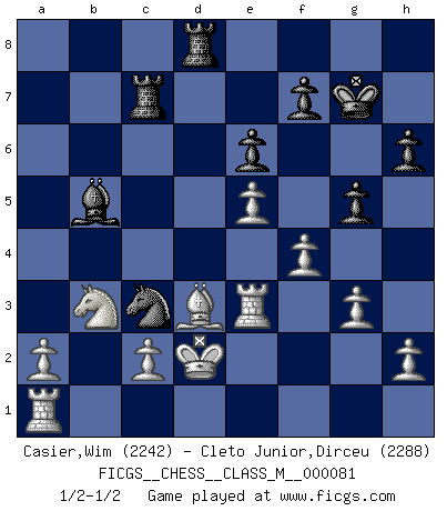Last move : 1/2-1/2 2019 March 22 18:16:7 [Event "FICGS__CHESS__CLASS_M__000081"] [Site "FICGS"] [Date "2018.12.07"] [Round "1"] [White "Casier,Wim"] [Black "Cleto Junior,Dirceu"] [Result "1/2-1/2"] [WhiteElo "2242"] [BlackElo "2288"] 1.e4 c5 2.Nf3 d6 3.d4 cxd4 4.Nxd4 Nf6 5.Nc3 Nc6 6.Bg5 e6 7.Qd2 a6 8.O-O-O Bd7 9.f4 Be7 10.Nf3 b5 11.Bxf6 Bxf6 12.Qxd6 Ra7 13.e5 Be7 14.Qd2 Qa5 15.Kb1 Bb4 16.Nd4 Bxc3 17.Qxc3 Qxc3 18.bxc3 Ne7 19.c4 O-O 20.g3 Rc7 21.cxb5 Nd5 22.b6 Nxb6 23.Bxa6 Nd5 24.Kb2 Nc3 25.Ra1 Rb8+ 26.Kc1 h6 27.Bd3 Ba4 28.Kd2 Rd8 29.Nb3 g5 30.Rhe1 Bb5 31.Re3 Kg7 1/2-1/2 Sicilian : Richter-Rauzer, Rauzer attack, 7...a6 Queenside Castling by player White (move 8) Kingside Castling by player Black (move 19) This chess game ended in a draw. Follow this game move after move (download)Botvinnik tried to take the mystery out of Chess, always relating it to situations in ordinary life. He used to call Chess a typical inexact problem similar to those which people are always having to solve in everyday life. (Garry Kasparov) Ich könnte leicht behaupten: Ja,ja, Leonid Breschnew wollte nicht, daß ich Weltmeister werde. In der Tat war die Sache komplizierter. (Viktor Kortschnoi) La pasion por jugar al Ajedrez es una de las mas inexplicables en el mundo. (H.G. Wells) Assurément je connaissais par expérience le mystérieux attrait de ce jeu royal, le seul entre tous les jeux inventés par les hommes qui échappe souverainement à la tyrannie du hasard, le seul où l'on ne doive sa victoire qu'à son intelligence ou plutôt à une certaine forme d'intelligence. Mais n'est-ce pas déjà le limiter injurieusement que d'appeler les échecs un jeu ? N'est-ce pas une science, un art ou quelque chose qui, comme le cercueil de Mahomet entre ciel et terre, est suspendu entre l'un et l'autre, et qui réunit un nombre incroyable de contraires ? [...] C'est une pensée qui ne mène à rien, une mathématique qui n'établit rien, un art qui ne laisse pas d'uvre, une architecture sans matière; et il l'a prouvé néanmoins qu'il était plus durable, à sa manière, que les livres ou que tout autre monument, ce jeu unique qui appartient à tous les peuples et à tous les temps, et dont personne ne sait quel dieu en fit don à la terre pour tuer l'ennui, pour aiguiser l'esprit et stimuler l'âme. Où commence-t-il, où finit-il ? (Stefan Zweig) That's absurd. I love it. (Gregory House, House M.D.)