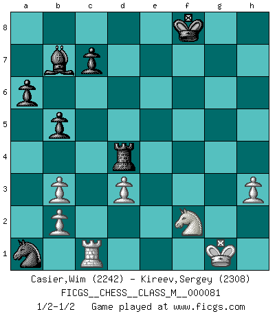 Last move : 1/2-1/2 2019 January 27 14:51:16 [Event "FICGS__CHESS__CLASS_M__000081"] [Site "FICGS"] [Date "2018.12.07"] [Round "1"] [White "Casier,Wim"] [Black "Kireev,Sergey"] [Result "1/2-1/2"] [WhiteElo "2242"] [BlackElo "2308"] 1.e4 e5 2.Nf3 Nc6 3.Bb5 a6 4.Ba4 Nf6 5.O-O Be7 6.Re1 b5 7.Bb3 O-O 8.h3 Bb7 9.d3 d5 10.exd5 Nxd5 11.Nxe5 Nd4 12.Nc3 Nb4 13.Bf4 Nxb3 14.axb3 f6 15.Ng4 Bc5 16.Qd2 f5 17.Ne5 Qd4 18.Nd1 Rad8 19.Kh1 Bb6 20.Be3 Qxe5 21.Bxb6 Qd6 22.Ba5 Nc6 23.f3 Rd7 24.Kg1 h6 25.Qf2 g5 26.Bd2 g4 27.fxg4 fxg4 28.Qh4 gxh3 29.Bxh6 Qd4+ 30.Qxd4 Nxd4 31.Bxf8 Nxc2 32.Nf2 Kxf8 33.gxh3 Rd4 34.Rec1 Nxa1 1/2-1/2 Ruy Lopez : Closed, 7...O-O Kingside Castling by player White (move 5) Kingside Castling by player Black (move 7) This chess game ended in a draw. Follow this game move after move (download)Personally, I rather look forward to a computer program winning the world Chess Championship. Humanity needs a lesson in humility. (Richard Dawkings) Unter Putin wird alles Geld aus Russland wie von einem Staubsauger nach Moskau umgeleitet, das ist wie ein schwarzes Loch. (Garry Kasparov) El pensamiento metódico es mas útil en el Ajedrez que la inspiración. (C. J. S. Purdy) Les Echecs ont trois composantes : le temps, l'espace et le matériel en dernier. (Mikhail Tal) Fear is the path to the dark side. Fear leads to anger; anger leads to hate; hate leads to suffering. I sense much fear in you. (Master Yoda in Star Wars ep.1)
